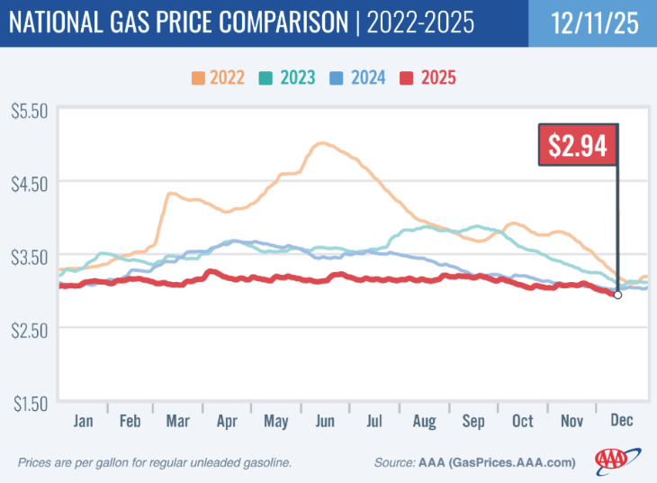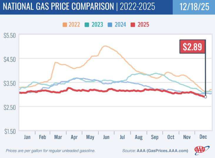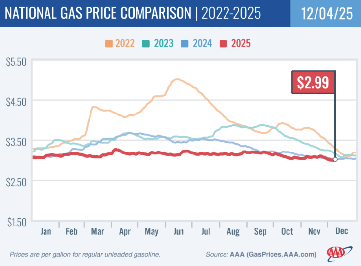 The national average gasoline price was $2.850/gal, slightly above $2.844 one week ago (+$0.006 WoW) and just below $2.855 one month ago (-$0.005 MoM), indicating largely stable pump prices.