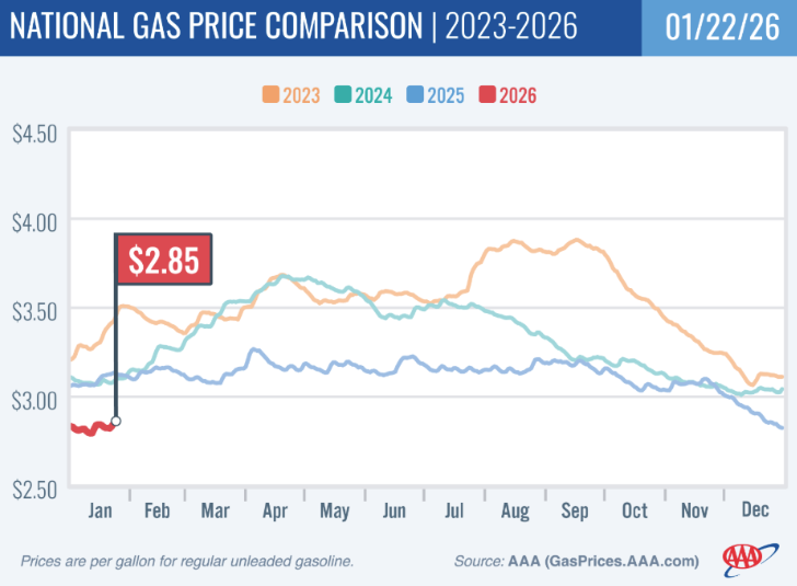 U.S. gasoline prices held near $2.85/gal in mid-January, reflecting seasonally weak winter demand.