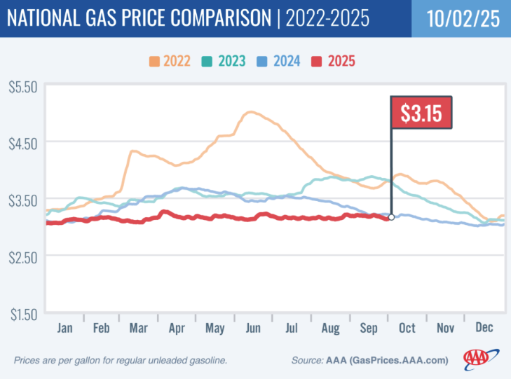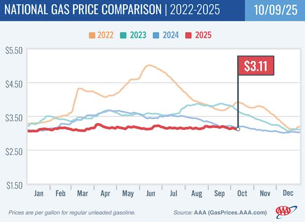 The AAA national average gas price dropped -4.9 cents to $3.110 last week. This is down -8.3 cents from a month ago and down -9.4 cents from a year ago.
