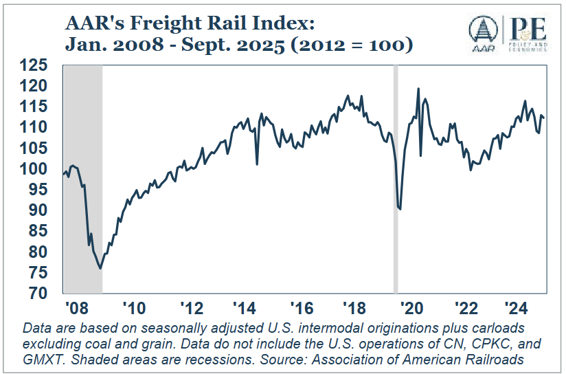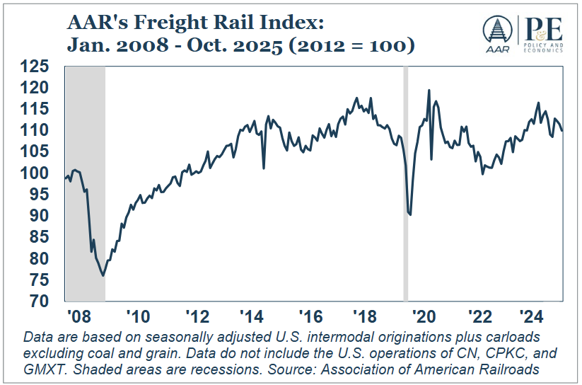 The AAR Freight Rail Index fell -1.4% MoM in October 2025 and -1.5% YoY, marking its sixth decline in seven months and reflecting a continued slowdown in underlying freight demand tied to industrial production and consumer goods flows.