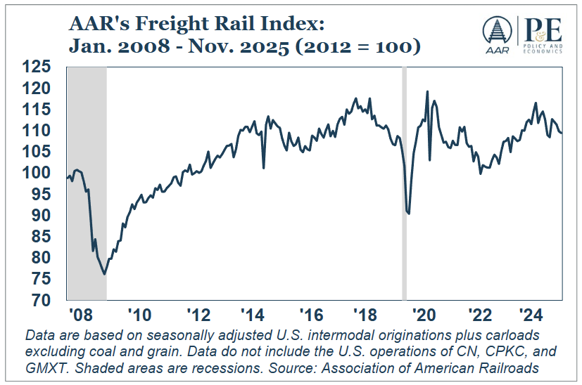The AAR Freight Rail Index fell -0.4% MoM in November 2025 and was down -4.4% YoY, marking its seventh decline in eight months and underscoring weaker underlying freight demand driven largely by intermodal softness.