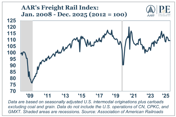 The AAR Freight Rail Index rose +3.1% MoM in January 2026, reflecting a short-term pickup in economy-sensitive rail volumes driven mainly by stronger carloads.