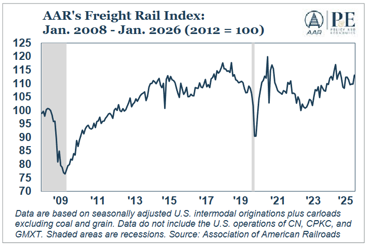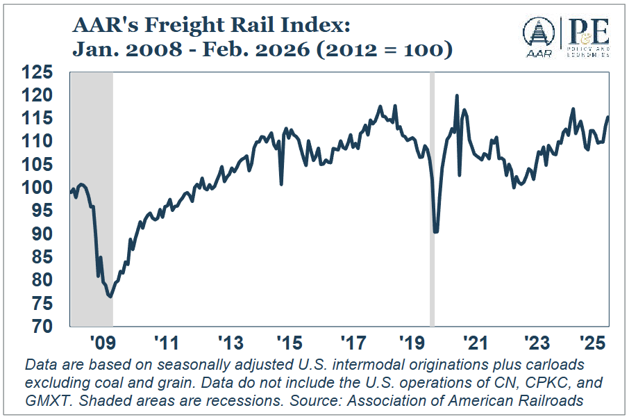 The AAR Freight Rail Index (FRI) tracks seasonally adjusted intermodal shipments and carloads excluding coal and grain, which together capture the rail traffic segments most sensitive to shifts in the broader economy. The index rose 1.8% in February over January, its third month-to-month increase in the past four months.