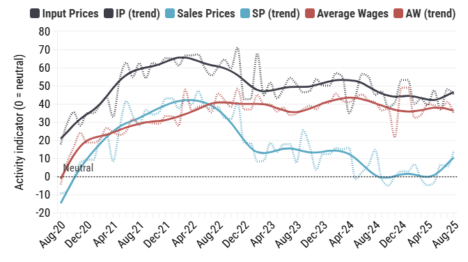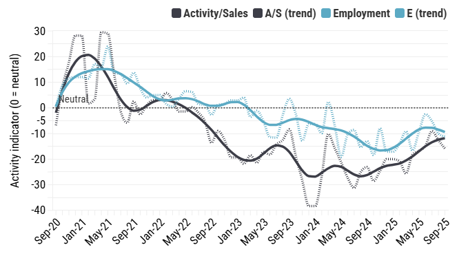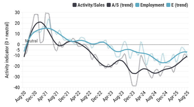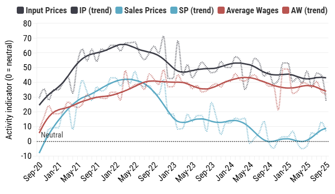 - The employment indicator returned to neutral for the first time in 18 months, led upwards by improving access to labour supply in the construction industry.