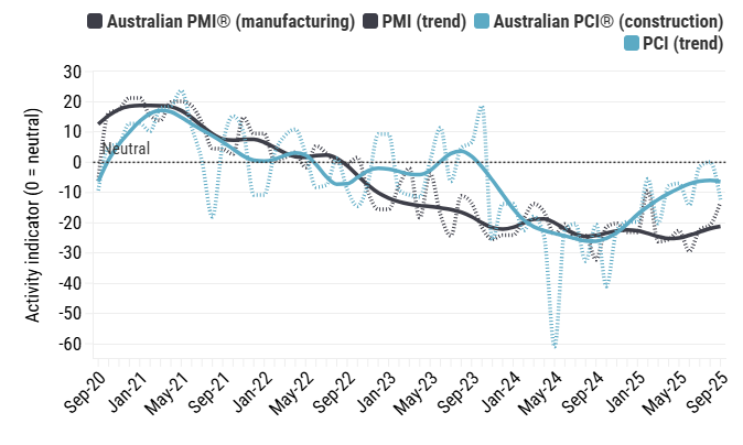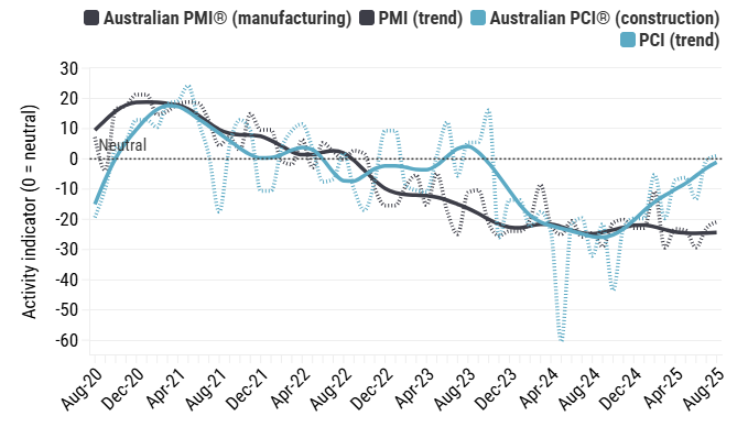 - Construction rose in the month, and in trend terms has seen steady improvement over the last year as supply constraints ease while market conditions improve.