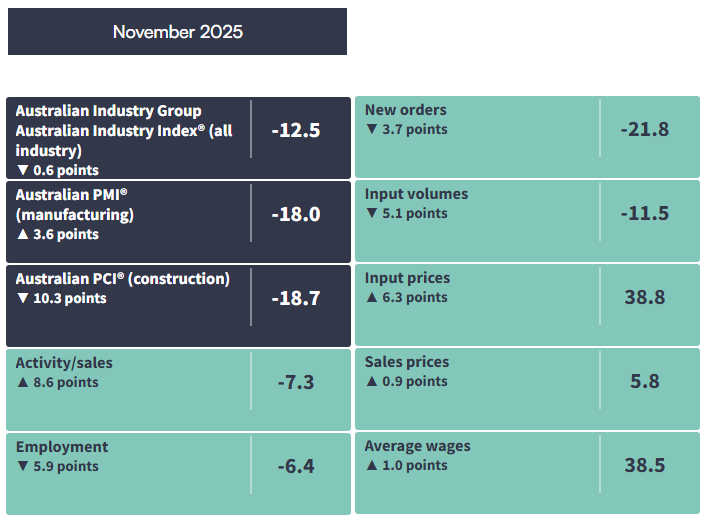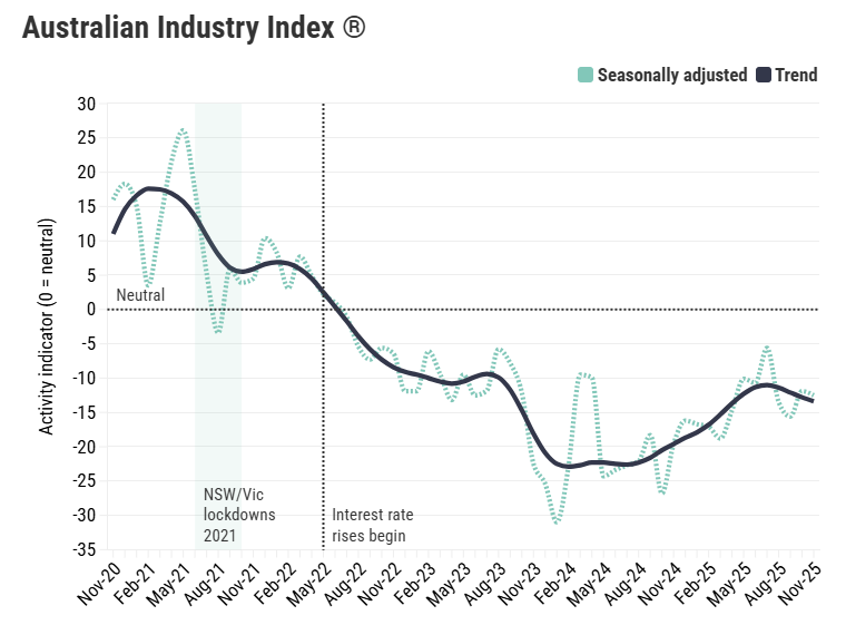 The Australian Industry Index® declined by 0.6 points to -12.5 seasonally adjusted in November.