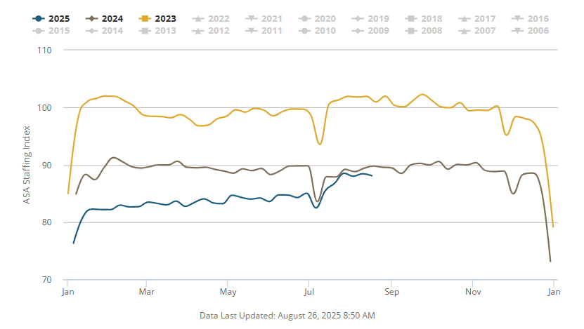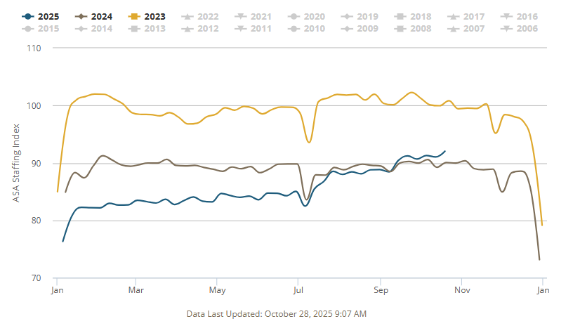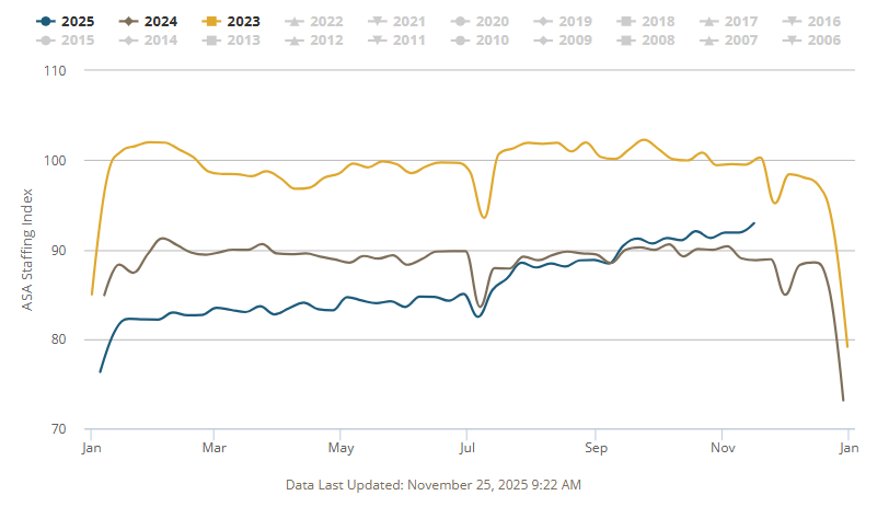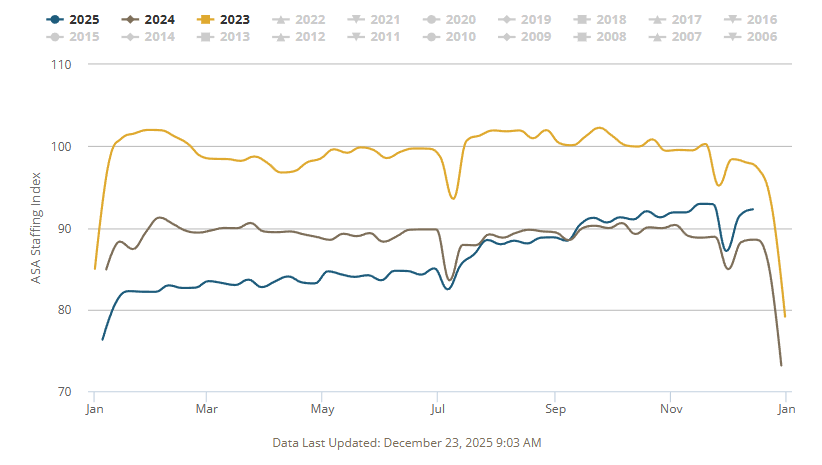 The ASA Staffing Index increased +0.9% WoW in mid-December, with staffing employment running +4.2% YoY, signaling steady late-year momentum.
