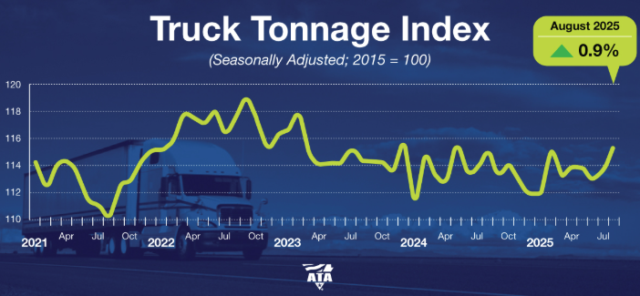 The ATA For-Hire Truck Tonnage Index rose 0.9% MoM in August 2025 to 115.3, while YoY growth slowed to 0.4%, marking the highest index level since December 2023.