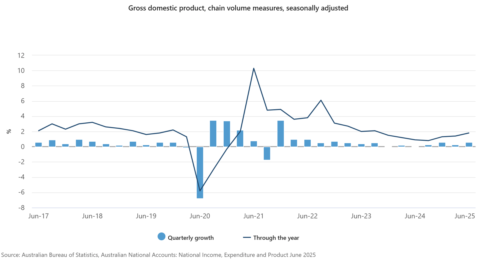 Australia’s GDP grew 0.6% QoQ (vs 0.5% QoQ expected) in Q2 2025 and 1.8% YoY (strongest YoY growth since Q3 2023), supported by household and government consumption. GDP per capita increased 0.2% QoQ and 0.2% YoY, and productivity saw similar gains.