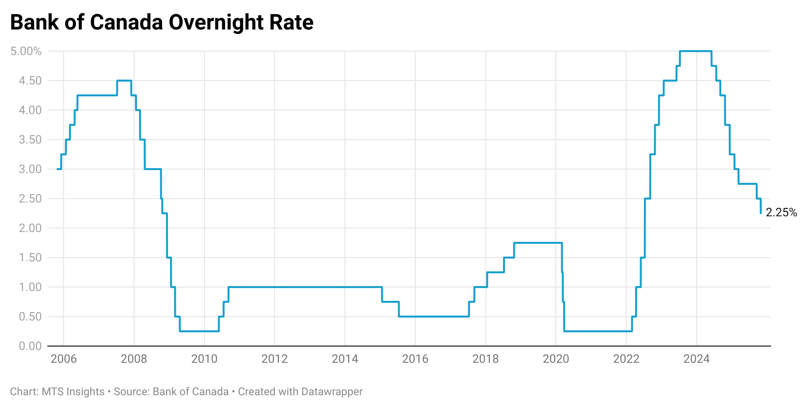The overnight rate remained 2.25% (Bank Rate 2.5%, deposit rate 2.20%), indicating continued policy stability amid heightened trade and geopolitical uncertainty.