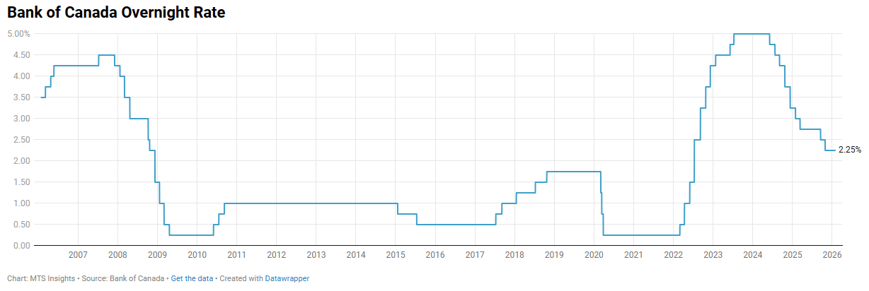The Bank of Canada held its policy rate at 2.25% in January 2026, keeping settings unchanged as growth slows and inflation stays near target.