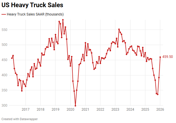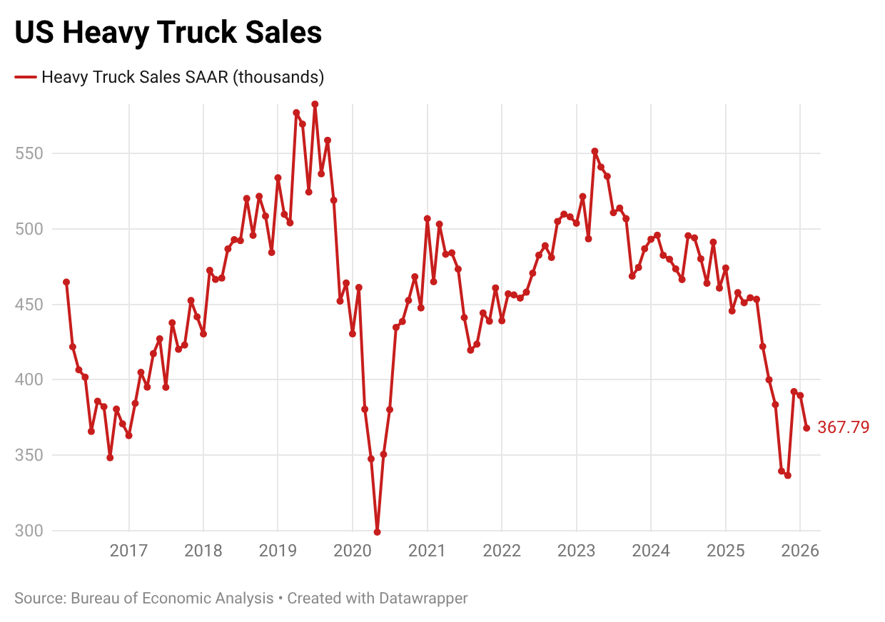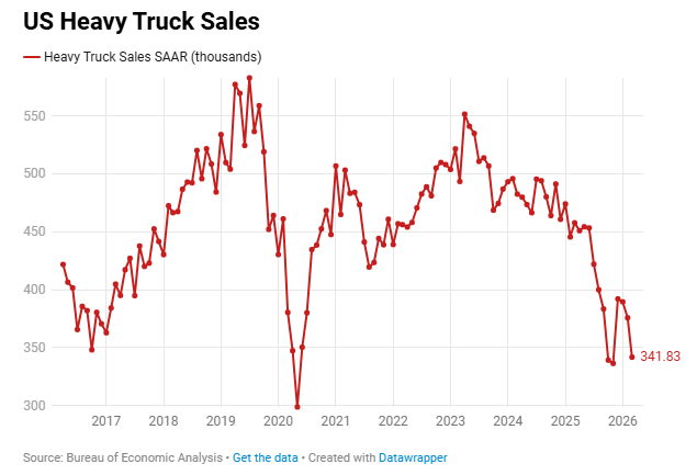 - Heavy truck sales dropped -9.0% MoM to a SAAR of 0.342 million in March and were now down -25.3% YoY. The sales pace is back near 6-year lows.
