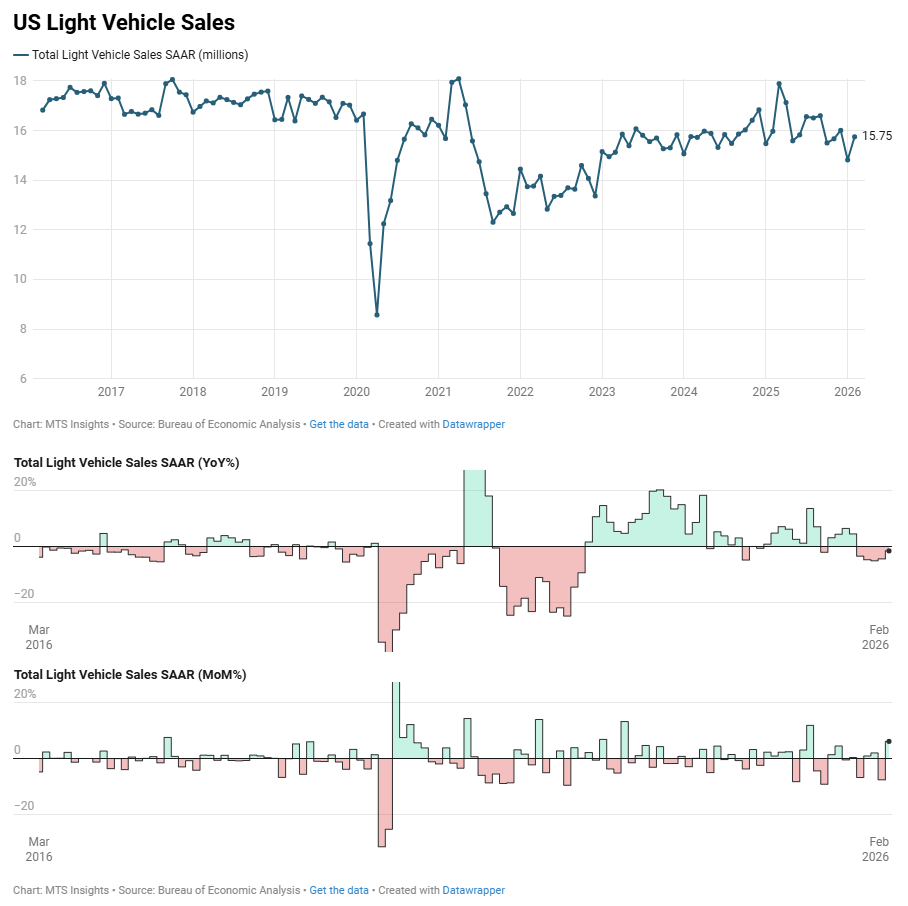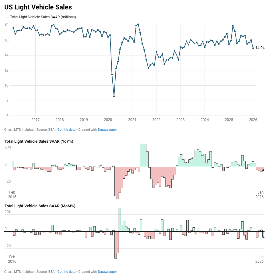 - Total light truck sales increased 4.3% MoM, with domestic truck sales up 4.8% MoM and foreign truck sales up 2.6% MoM. The light truck sales SAAR of 13.65 million was down -7.1% YoY.