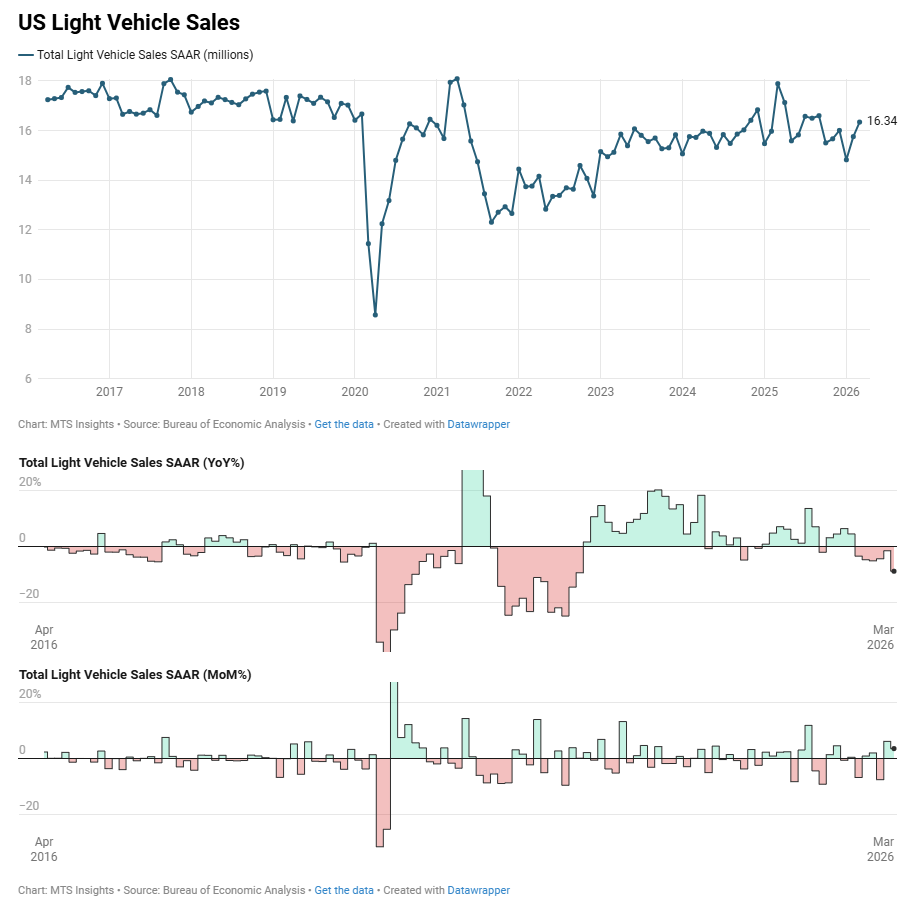 US total vehicle sales increased 3.4% MoM to a SAAR of 16.69 million in March but were down -9.1% YoY. Light vehicle sales increased 3.7% MoM to a SAAR of 16.34 million but were down -8.7% YoY.