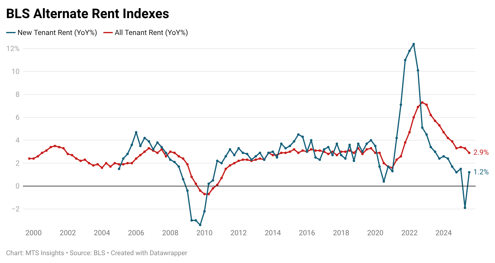 The BLS New Tenant Rent Index was up 1.2% YoY in Q3 2025, well above the -1.9% YoY decline recorded for Q2 2025 (revised up significantly from the 1st estimate of -9.3% YoY).