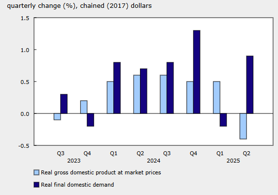 Canada’s real GDP rose +0.6% QoQ in Q3 2025 (after -0.5% in Q2), marking a rebound driven primarily by a stronger trade balance as imports fell sharply and exports edged higher.