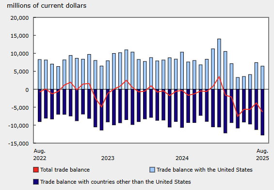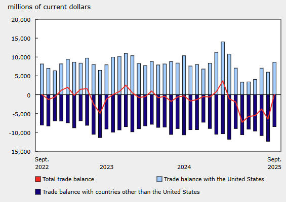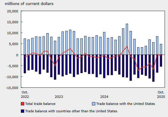 Canada’s merchandise trade balance swung from a +$243M surplus in September to a -$583M deficit in October, as imports rose +3.4% MoM and exports increased +2.1% MoM amid gold-driven volatility.
