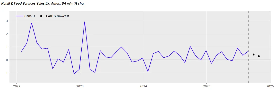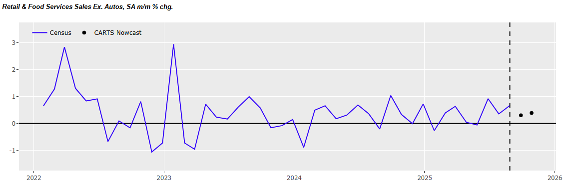 - The nowcast for retail & food services sales (ex autos) price growth is 0.1% MoM and 2.0% YoY, revised up slightly from the preliminary estimate of 0.1% MoM and 1.9% YoY.