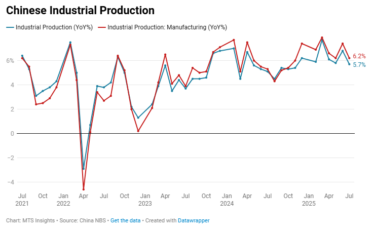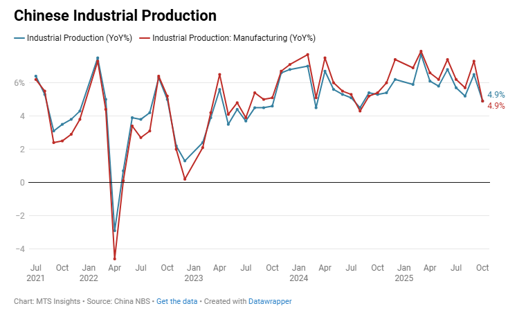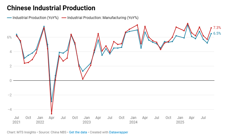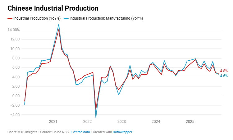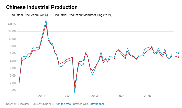 China’s industrial production rose +0.49% MoM and +5.2% YoY (vs +5.0% YoY expected) in December 2025, showing steady late-year output growth with strength concentrated in manufacturing and high-tech sectors.