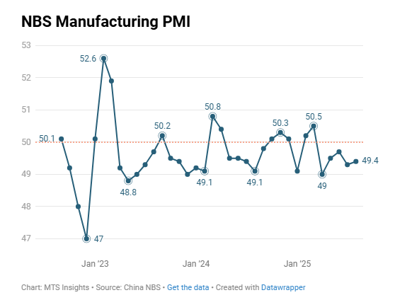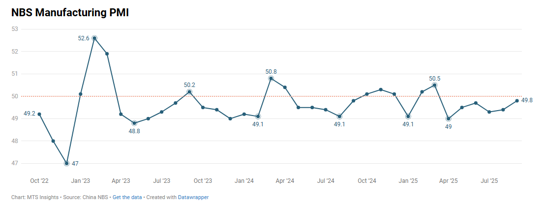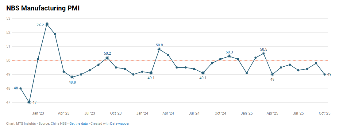 China’s Manufacturing PMI fell to 49.0 in October 2025 (from 49.8 in September), marking a return to contraction and reflecting weaker production and demand conditions across most enterprise sizes.