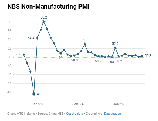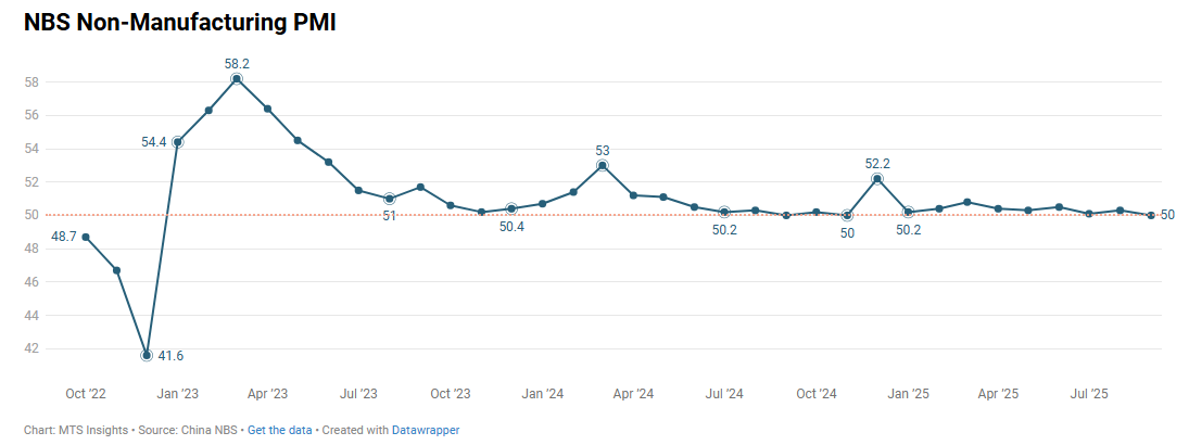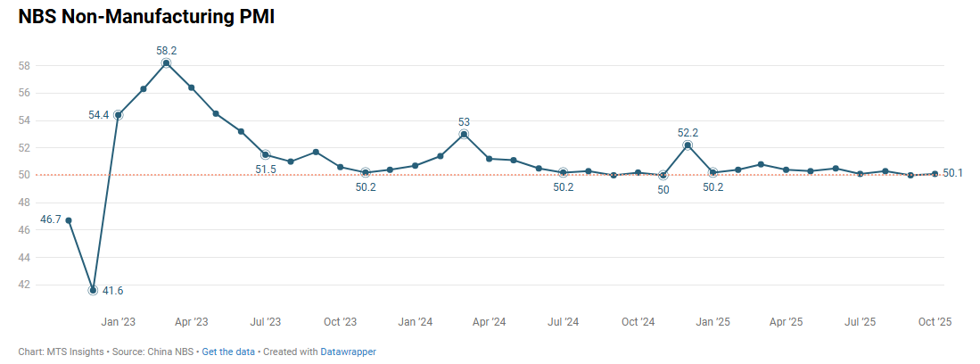 China’s Non-Manufacturing PMI edged up +0.1 pts to 50.1 in October 2025, signaling broadly stable activity across services and construction with mild improvement in employment and optimism.