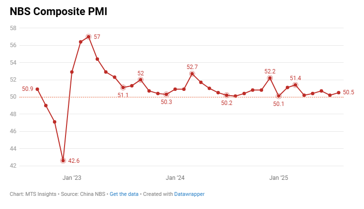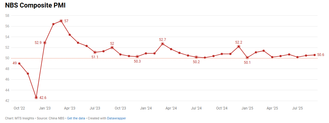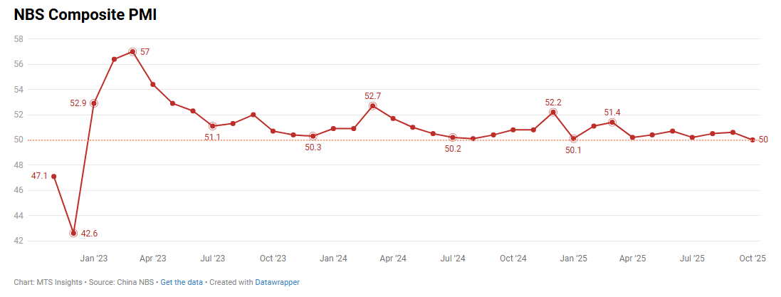 China’s Composite PMI Output Index fell -0.6 pts to 50.0 in October 2025, the weakest since December 2022 as the economy moved from marginal growth to stagnation.