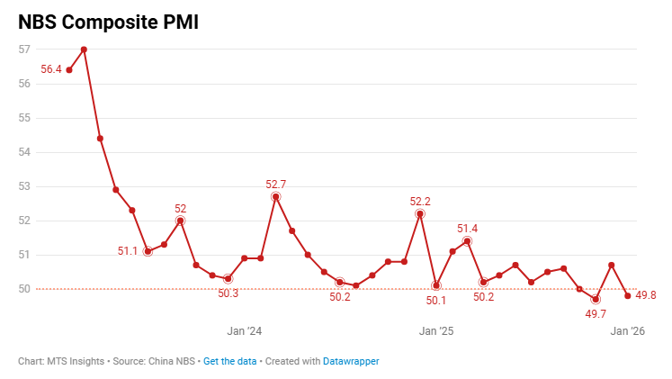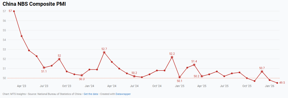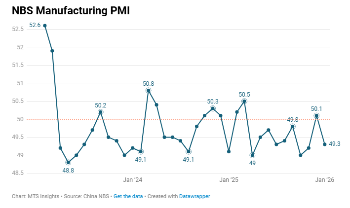 China’s NBS Manufacturing PMI fell to 49.3 in January 2026 (-0.8 pts MoM), slipping back into contraction alongside weaker demand conditions.