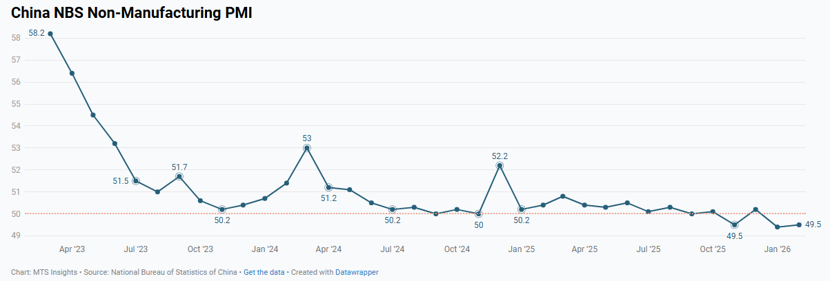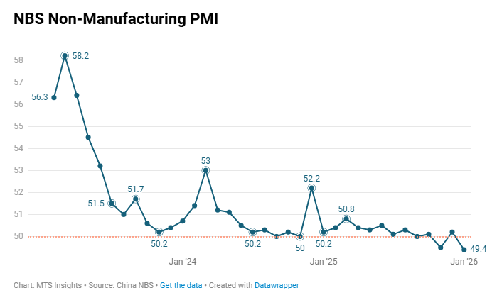 China’s NBS Non-manufacturing PMI slipped to 49.4 in January 2026 (-0.8 pts MoM), reflecting softer service and construction activity.