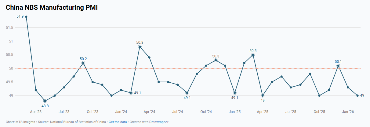China’s NBS Manufacturing PMI declined to 49.0 in February 2026 (-0.3 pts MoM), remaining below the 50 threshold and signaling a further weakening in manufacturing conditions alongside softer production and demand indicators.