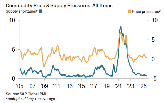 The Global Price Pressures Index held steady at 0.5 in October 2025, showing continued subdued inflation in manufacturing inputs, while the Global Supply Shortages Index also remained unchanged at 0.5, indicating stable and below-average supply constraints.