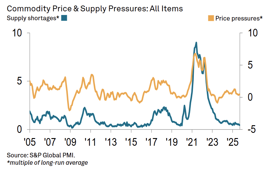 Overall, the report signaled that global manufacturing input markets remained balanced, with localized tightness in semiconductors offset by easing pressures elsewhere.