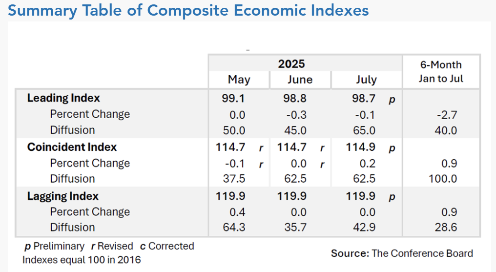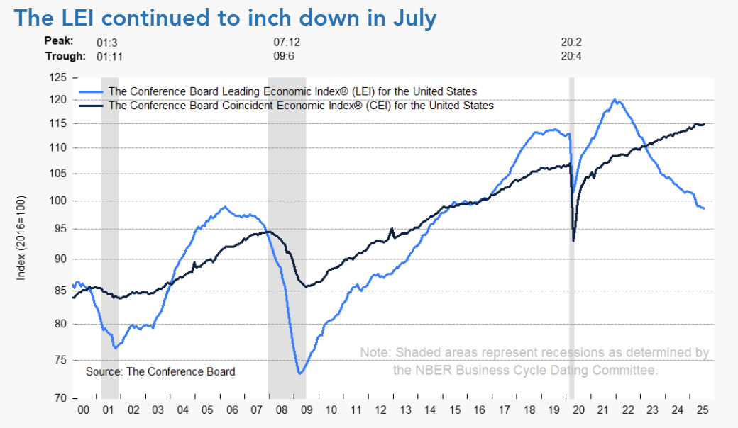 The Conference Board Leading Economic Index (LEI) for the US fell -0.5% MoM to 98.4 in August 2025, its steepest drop since April, and is down -2.8% over the past six months, pointing to persistent headwinds.