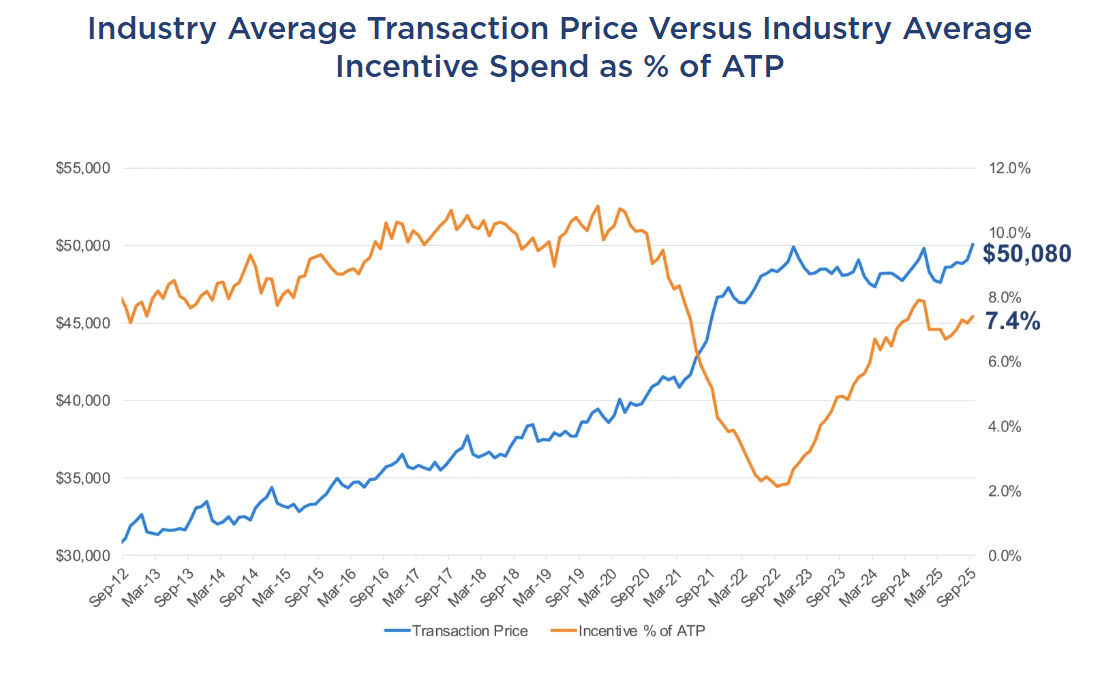 Incentive spending rose to 7.4% of ATP (≈$3,700), the highest level of 2025, compared with 7.2% in August and 7.3% in September 2024.