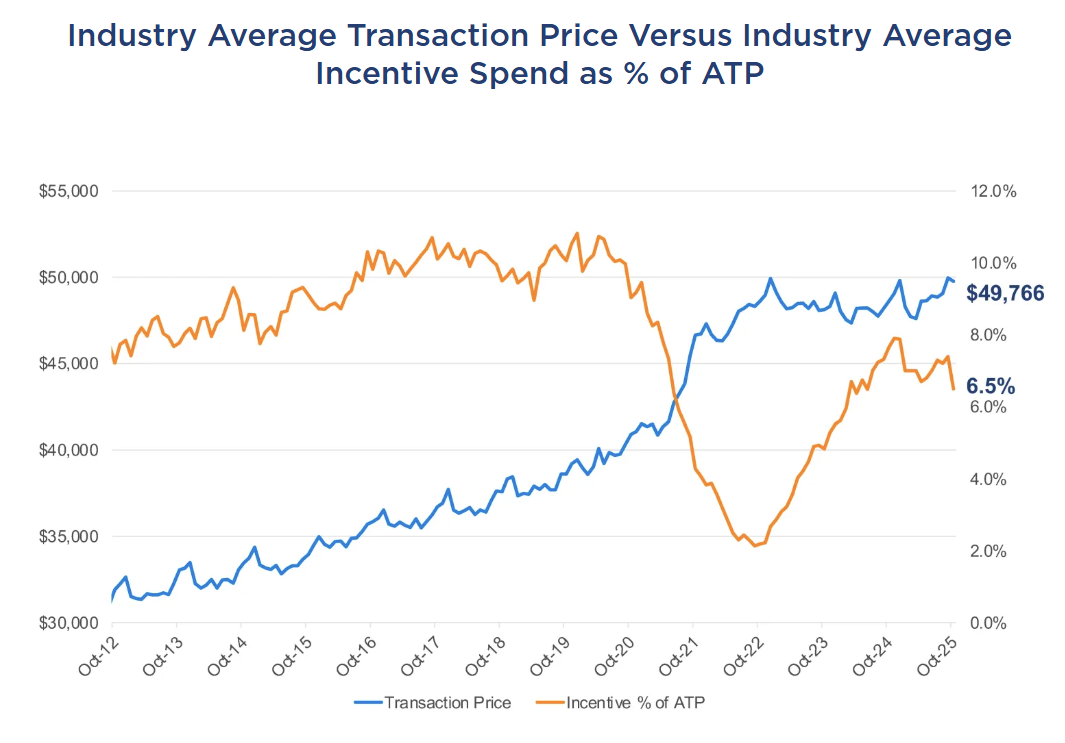 The U.S. new-vehicle average transaction price (ATP) slipped -0.4% MoM to $49,766 in October but remained +2.1% YoY, reflecting a modest pullback from September’s record high as EV sales dropped sharply after incentive expirations.