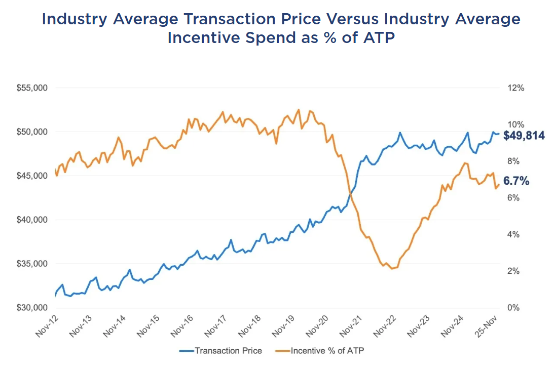 Incentives averaged 6.7% of ATP ($3,347), up from 6.5% in October but below the 7.9% level one year earlier, indicating slightly more discounting MoM but still tighter incentives than last year.