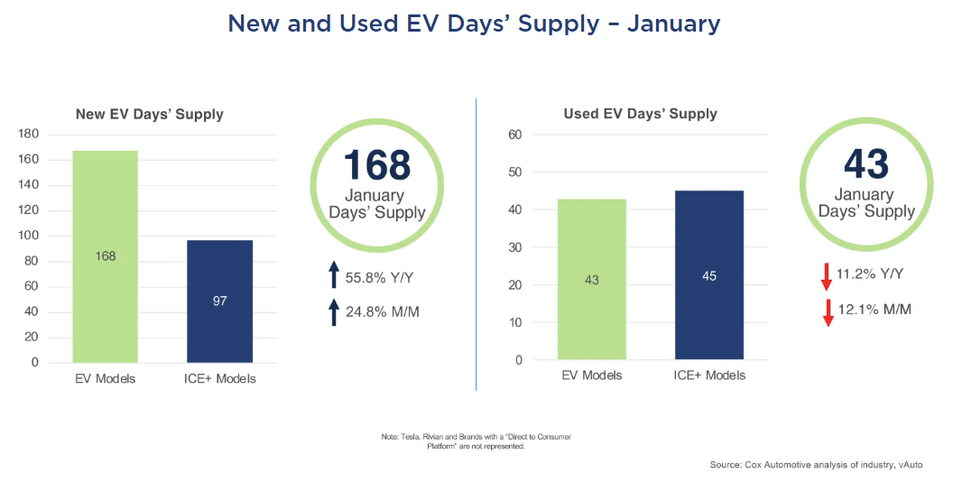 EV Days’ Supply: New EV days’ supply rose to 168 days in January, 55.8% higher than year‑earlier levels and up 24.8% month over month. The gap between EV and ICE+ days’ supply widened to 71 days, up from 59 days last month. At 168 days, new EV days’ supply is at its highest level since July 2024 and has nearly quadrupled from September’s near‑record low of 46 days. EV supply sat below ICE+ levels as recently as late October – that gap has since reversed by roughly 78 days.
