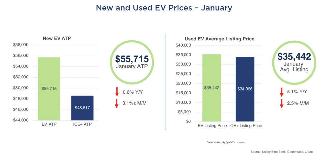 New EV ATP: The average transaction price (ATP) for new EVs in January was $55,715, down 0.6% year over year and 3.1% lower month over month. The EV premium over ICE+ narrowed to $7,098, the slimmest gap since July 2025. Incentives fell sharply from December’s record levels, averaging $6,918 or 12.4% of ATP, down from an upwardly revised 18.3% in December and below the 2025 full‑year average of 13.7%. Tesla saw its ATP decline 2.0% to $52,628, continuing to exert downward pressure on the overall EV average. Among other high‑volume brands, Mercedes-Benz (+7.9%) and Ford (+6.6%) recorded the largest month-over-month ATP increases, while Volvo (-23.5%) and Audi (-3.8%) posted the steepest declines.