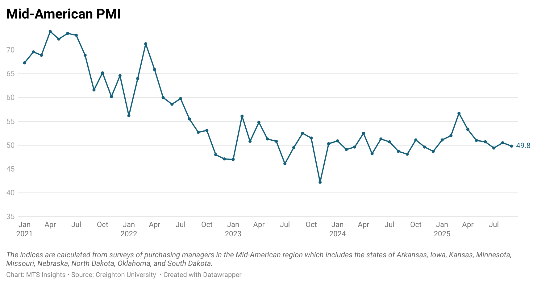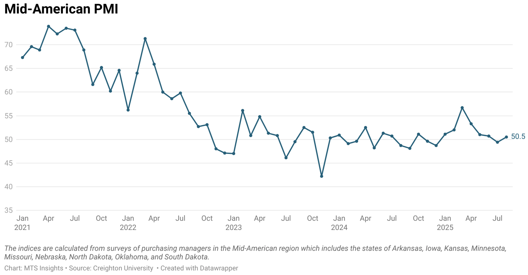 OMAHA, Neb. (Sept. 2, 2025) — For the seventh time in 2025, the Creighton University Mid-America Business Conditions Index, a leading economic indicator for the nine-state region stretching from Minnesota to Arkansas, rose slightly above growth neutral in August.Overall Index: The Business Conditions Index, which uses the identical methodology as the national Institute for Supply Management (ISM) and ranges between 0 and 100 with 50.0 representing growth neutral, climbed to 50.5 from 49.4 in July.