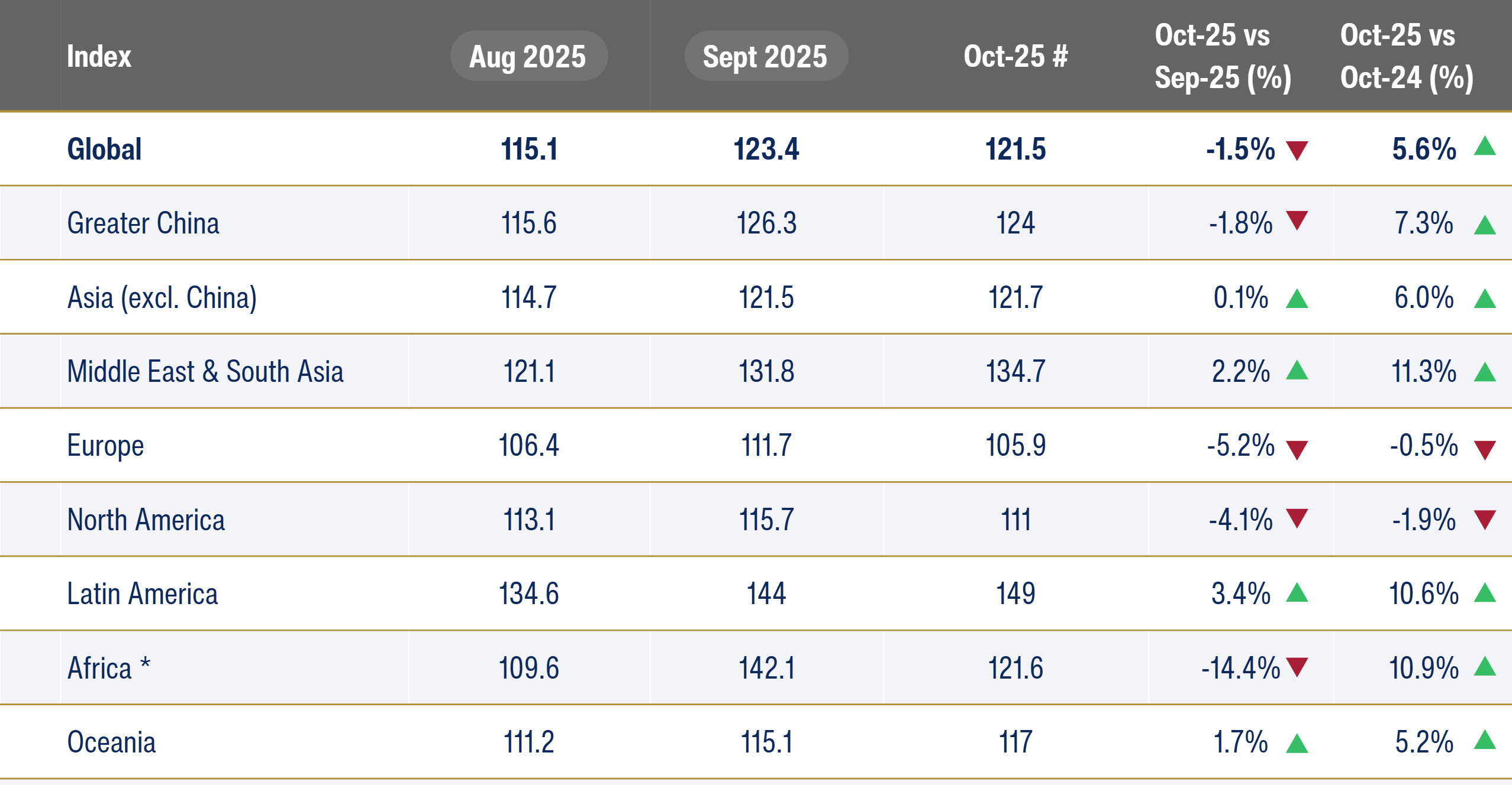 - TThe Greater China Container Port Throughput Index fell 1.8% MoM in October, up 7.3% YoY. The 12-month average growth rate in Greater China rose to 5.5%, remaining below the global average of 6.0%. Throughput growth across the major ports of Greater China was varied in October, although all of them except Hong Kong remain ahead of last year. Shanghai volumes fell 6.2% MoM, but were up 9.2% YoY. The Pearl River Delta ports recovered from the impact of Super Typhoon Ragasa in October-Shenzhen volumes jumped 18.8% MoM and 11.7% YoY, while at Guangzhou they surged 14.4% MoM, up 2.0% YoY. Hong Kong also recovered in the month, with volumes up 14.6% MoM, although lower by 7.0% YoY.