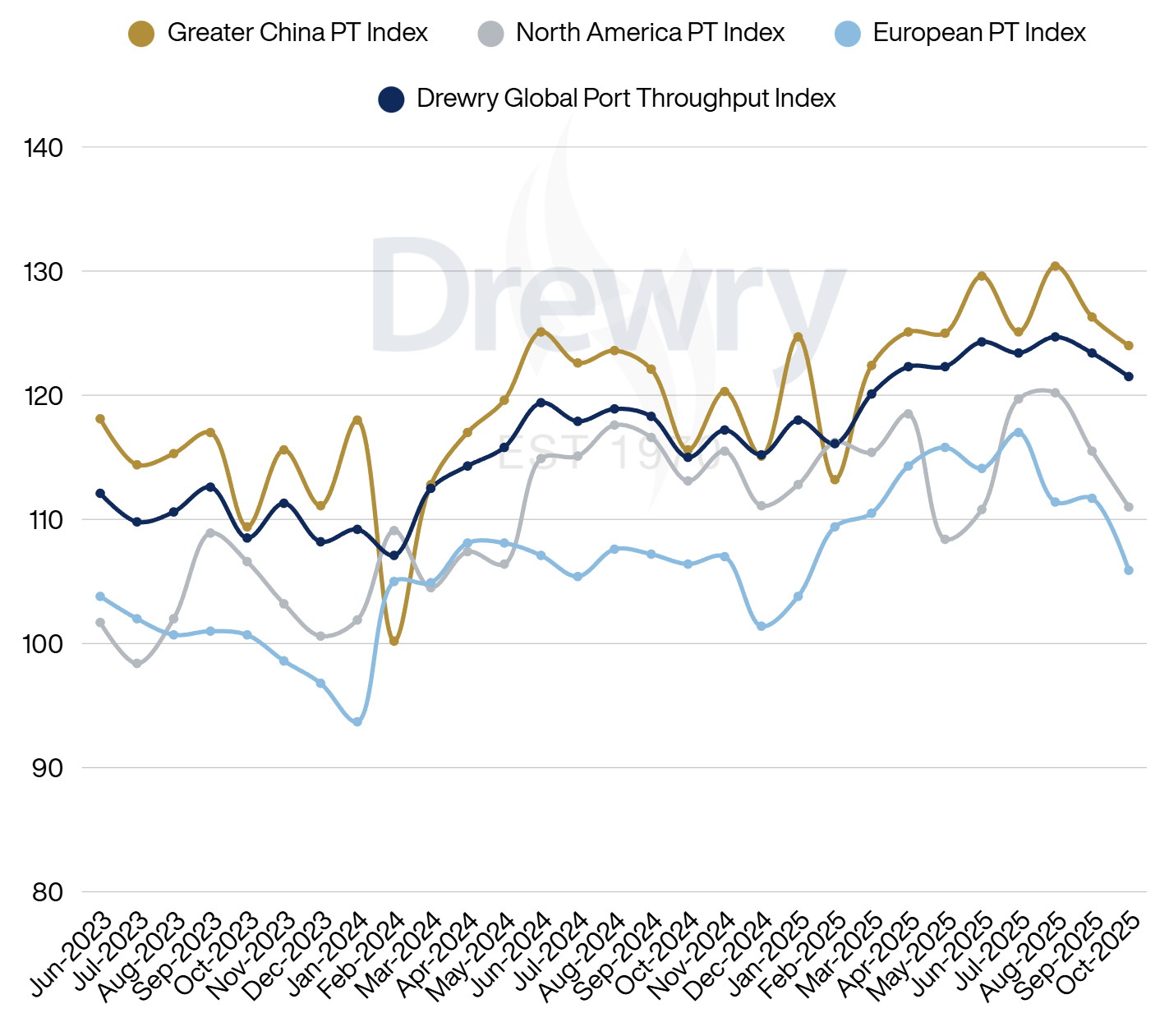 Drewry’s Global Container Port Throughput Index decreased 1.5% MoM in October, but remained up 5.6% YoY, and the rolling 12-month average growth rate for global port handling fell to 6.0%. As 2025 has progressed, YTD growth, which reached 5.7% for our sample, has persistently outpaced the full year forecasts which have been regularly upgraded to reflect latest trading conditions. Growth continues to be driven by the Middle East and South Asia region, up 11.3% YoY and 8.7% YTD, ably assisted by Latin America (up 10.6% YoY and 6.8% YTD) and Africa (up 10.9% YoY and 6.5% YTD).