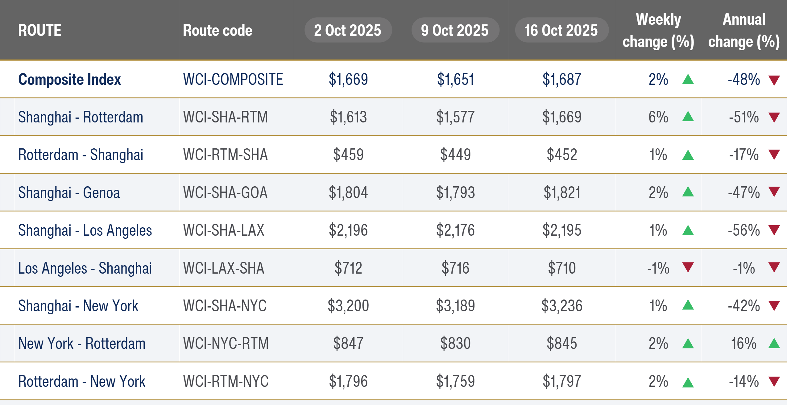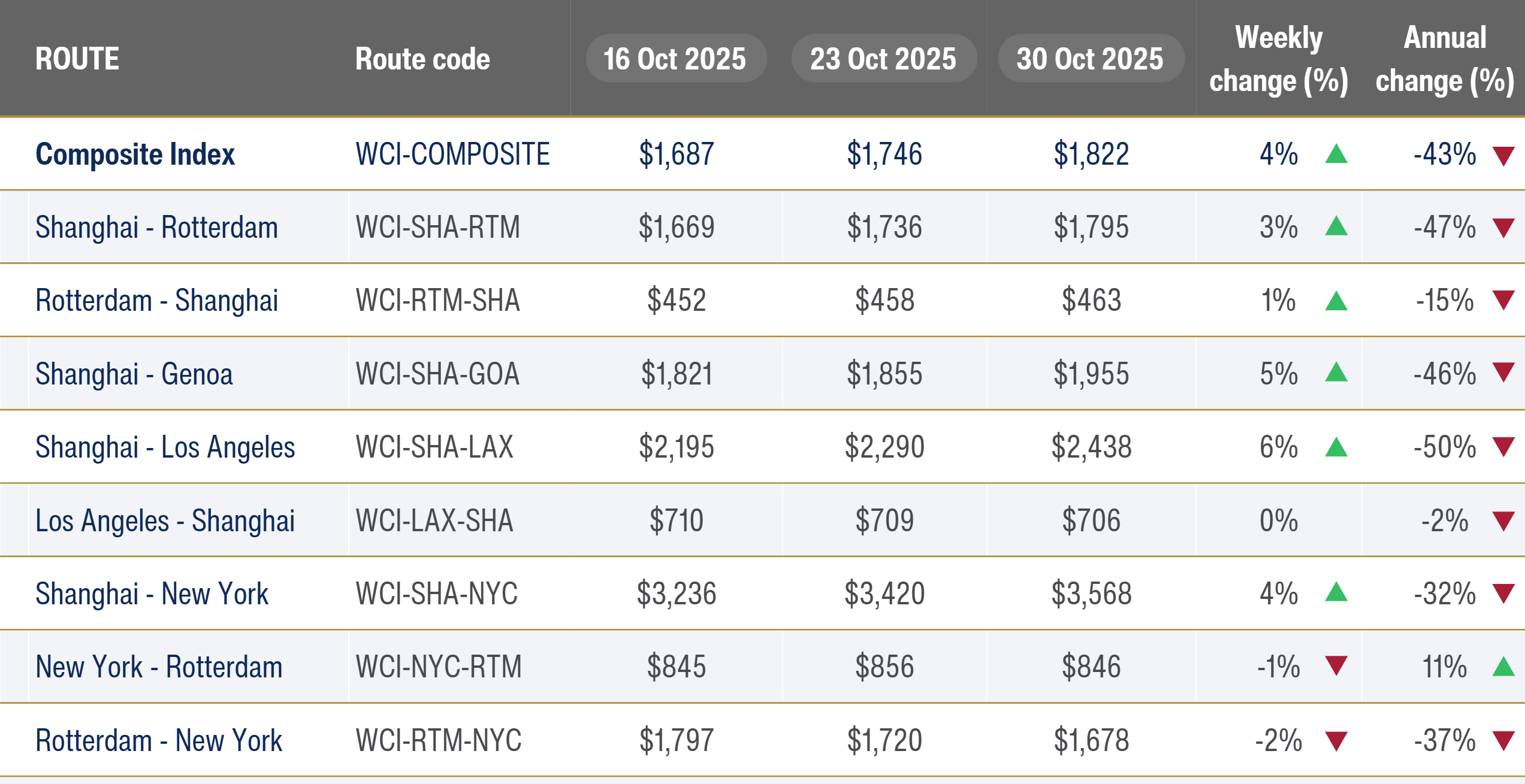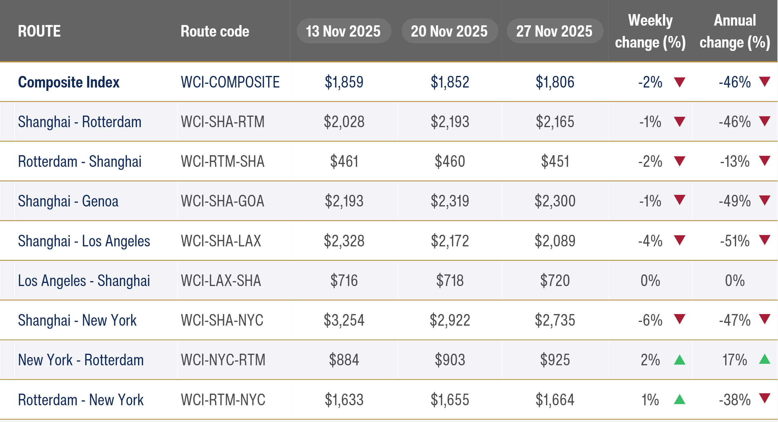 The Drewry World Container Index (WCI) fell -2% WoW to $1,806 per 40ft container, reflecting broad rate declines across both Transpacific and Asia–Europe lanes amid softer demand and rising available capacity.