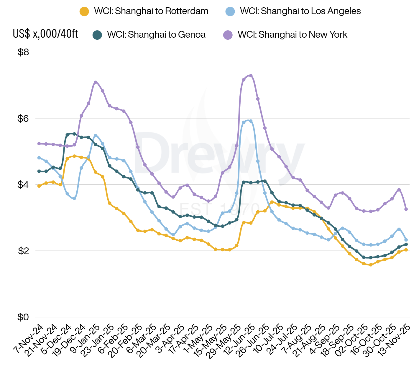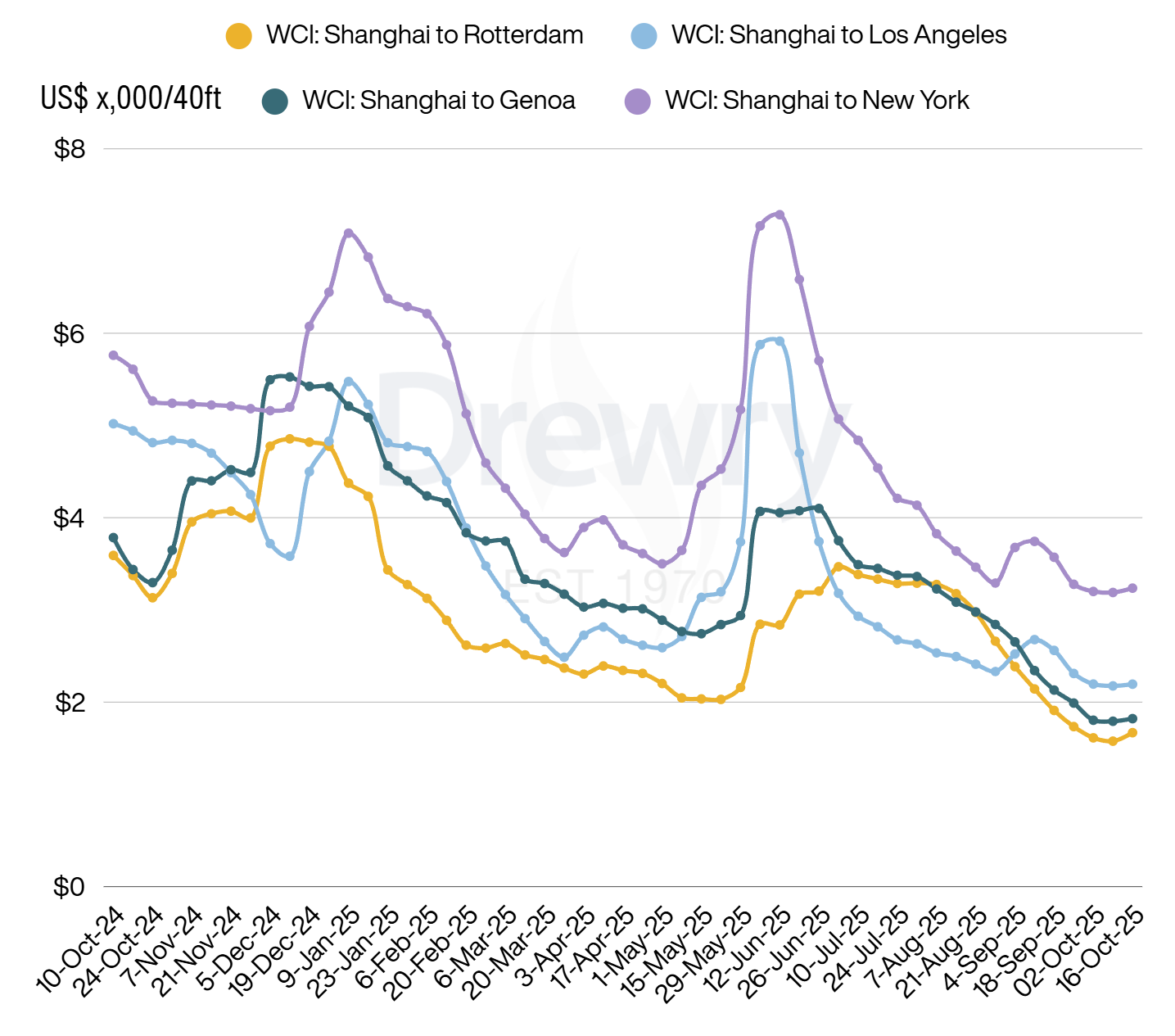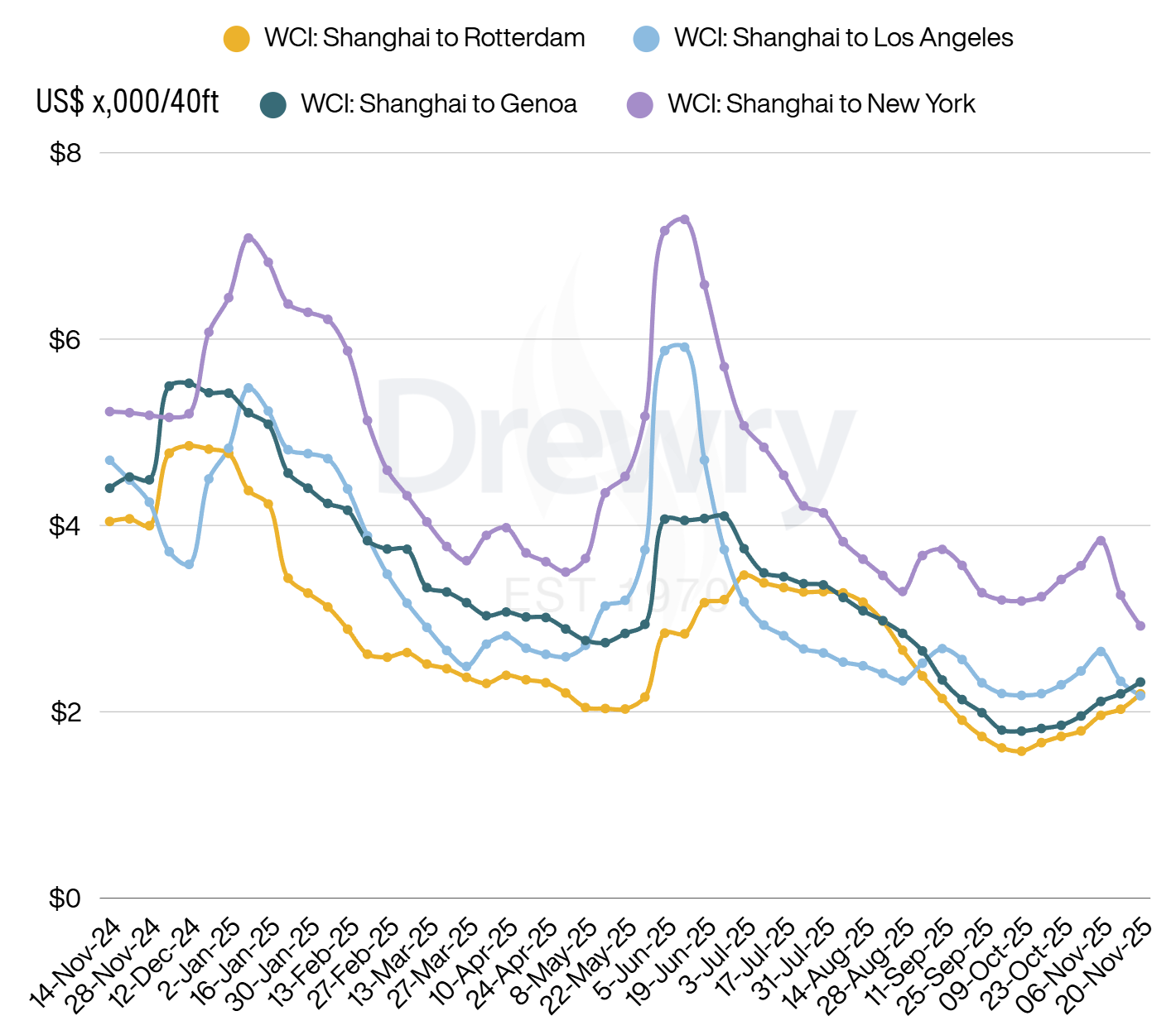 Shanghai–Los Angeles fell -4% WoW to $2,089, with Drewry noting that fewer blank sailings next week could increase capacity and apply further downward pressure on rates.
