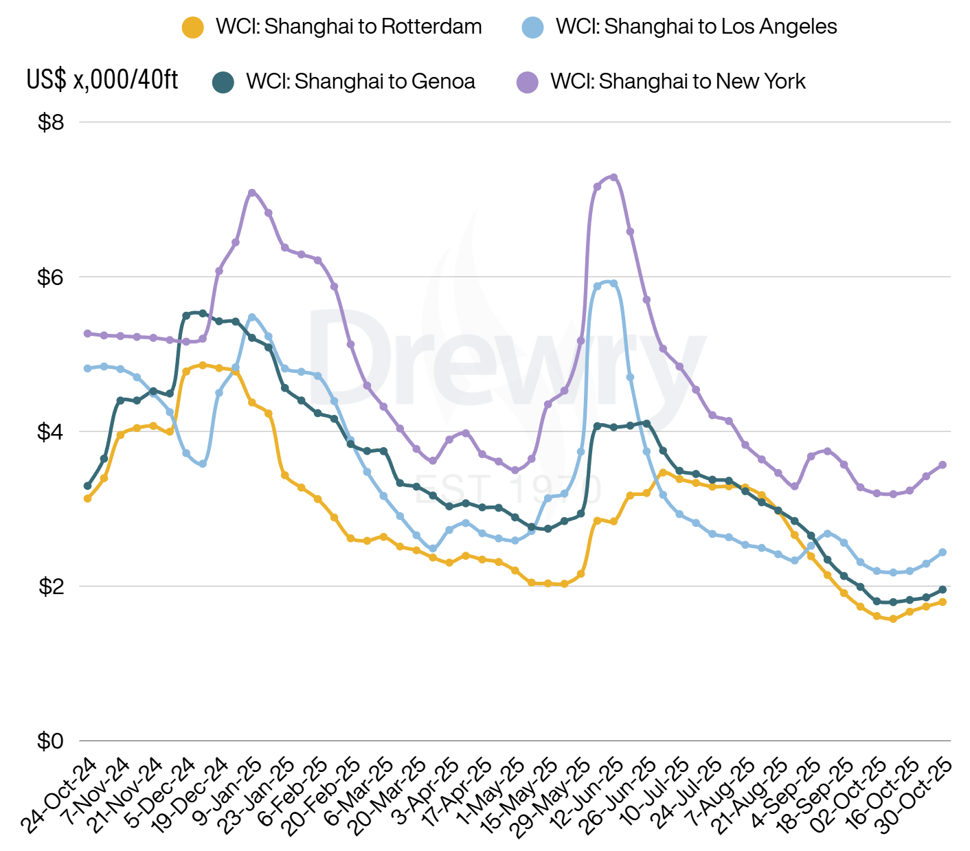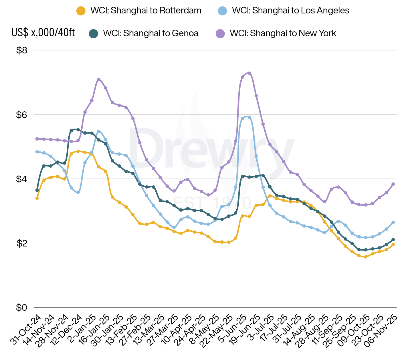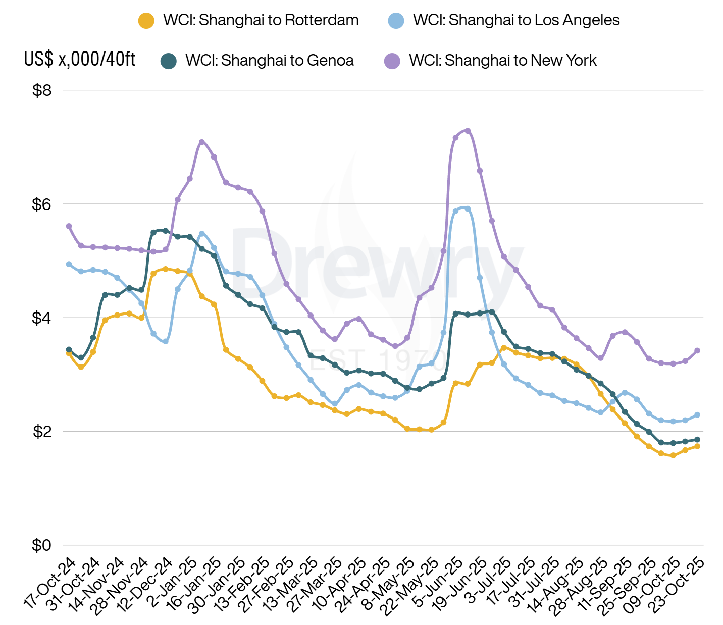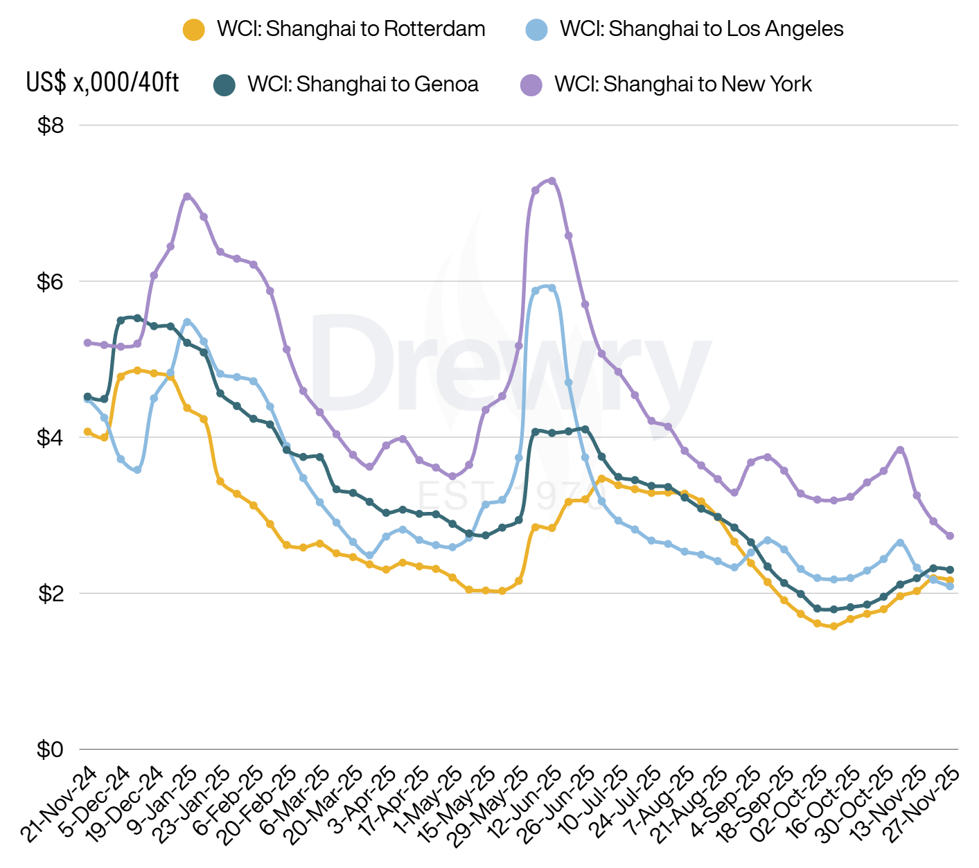 Shanghai–Los Angeles fell -4% WoW to $2,089, with Drewry noting that fewer blank sailings next week could increase capacity and apply further downward pressure on rates.