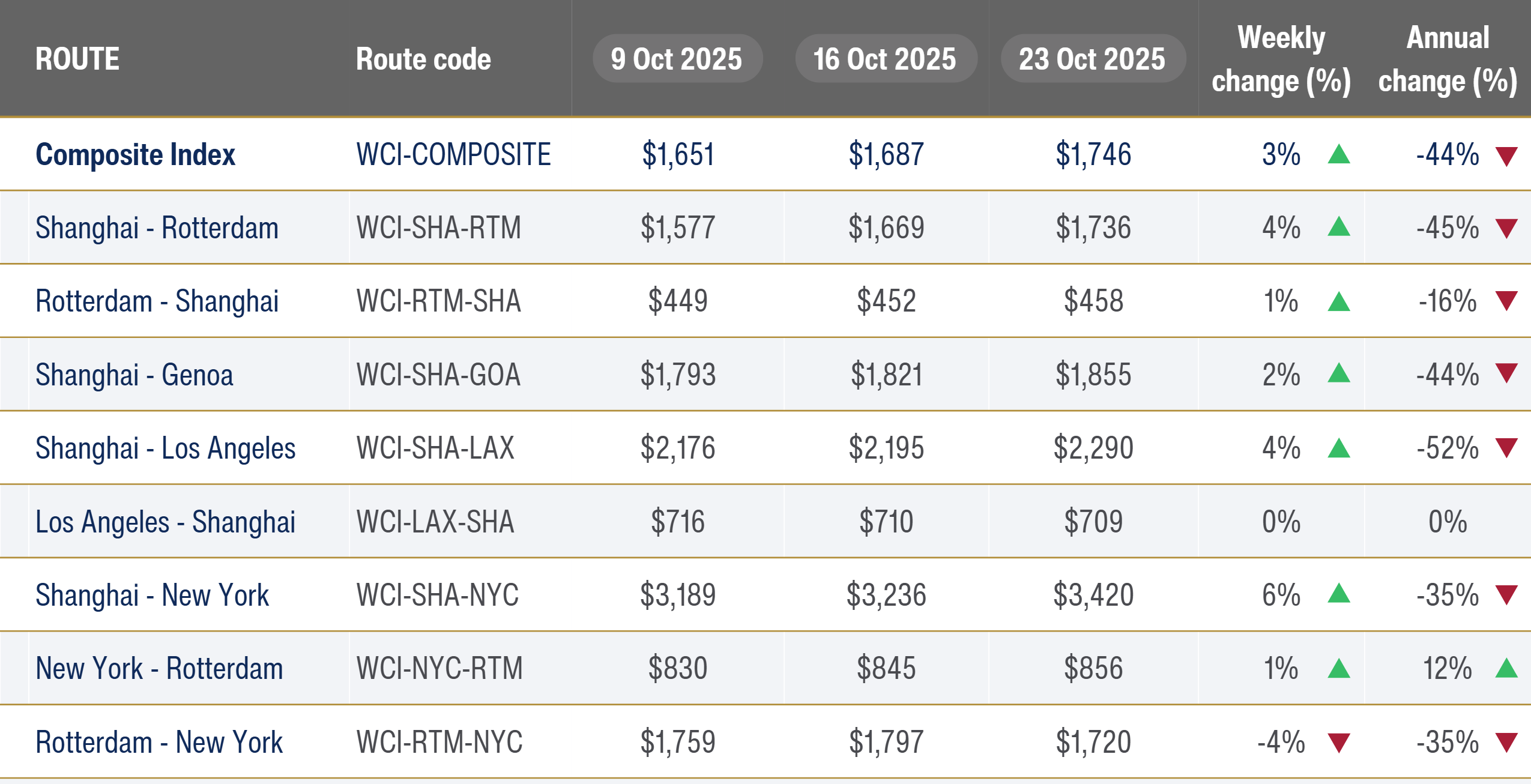 Shanghai–Genoa and Shanghai–Rotterdam both declined -1% WoW, to $2,300 and $2,165 respectively, ending a six-week streak of increases on the Asia–Europe corridor.