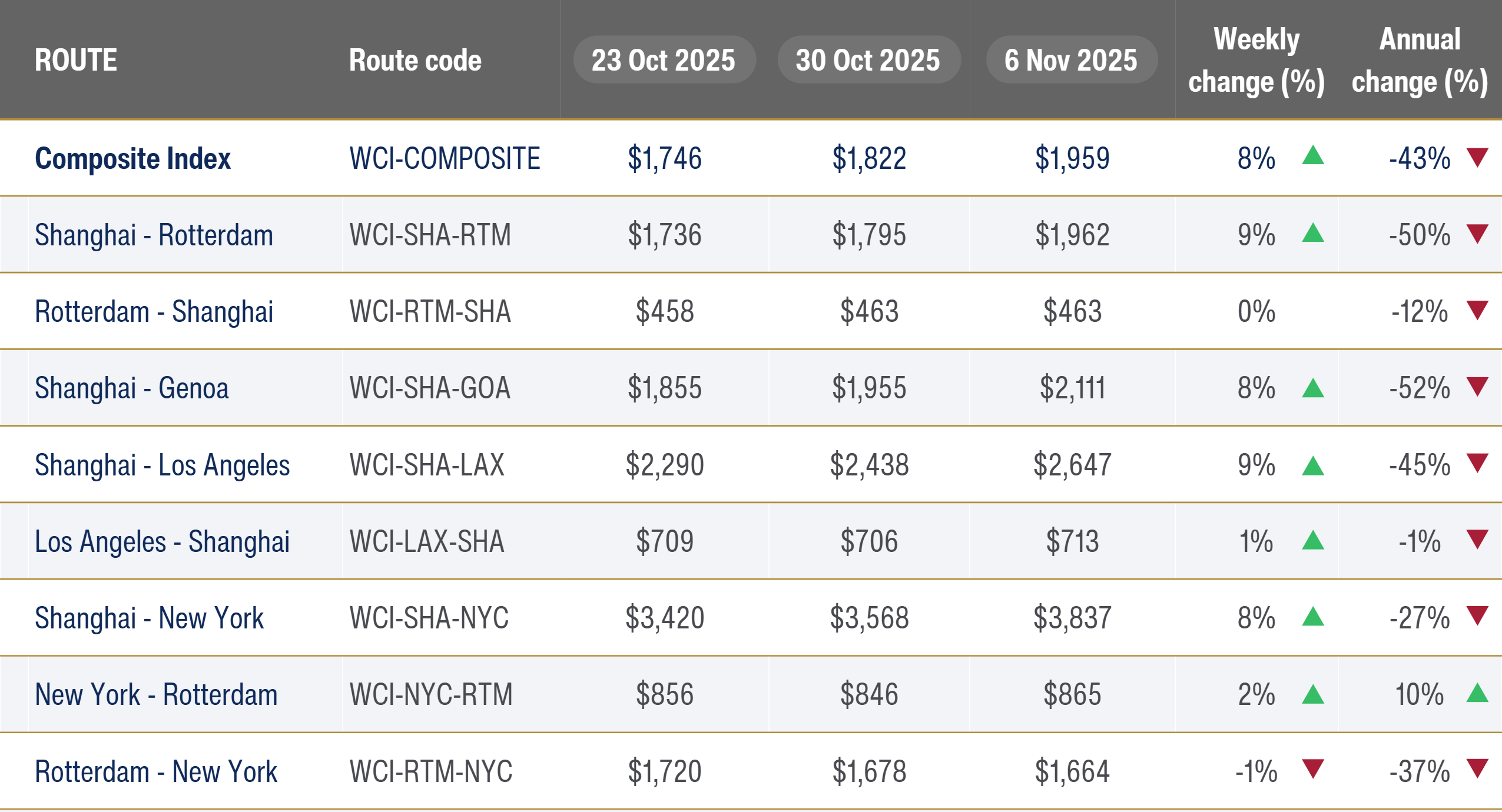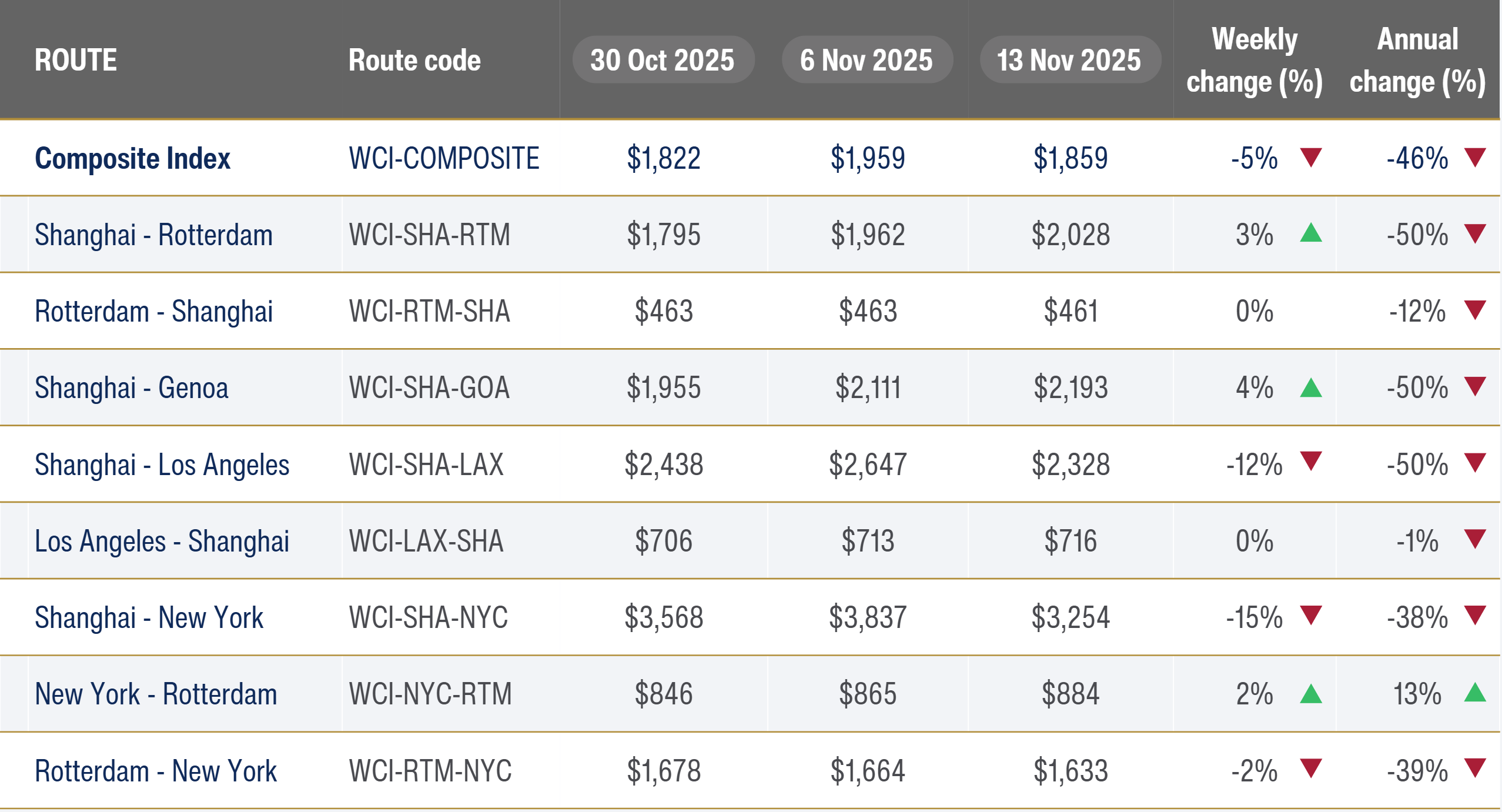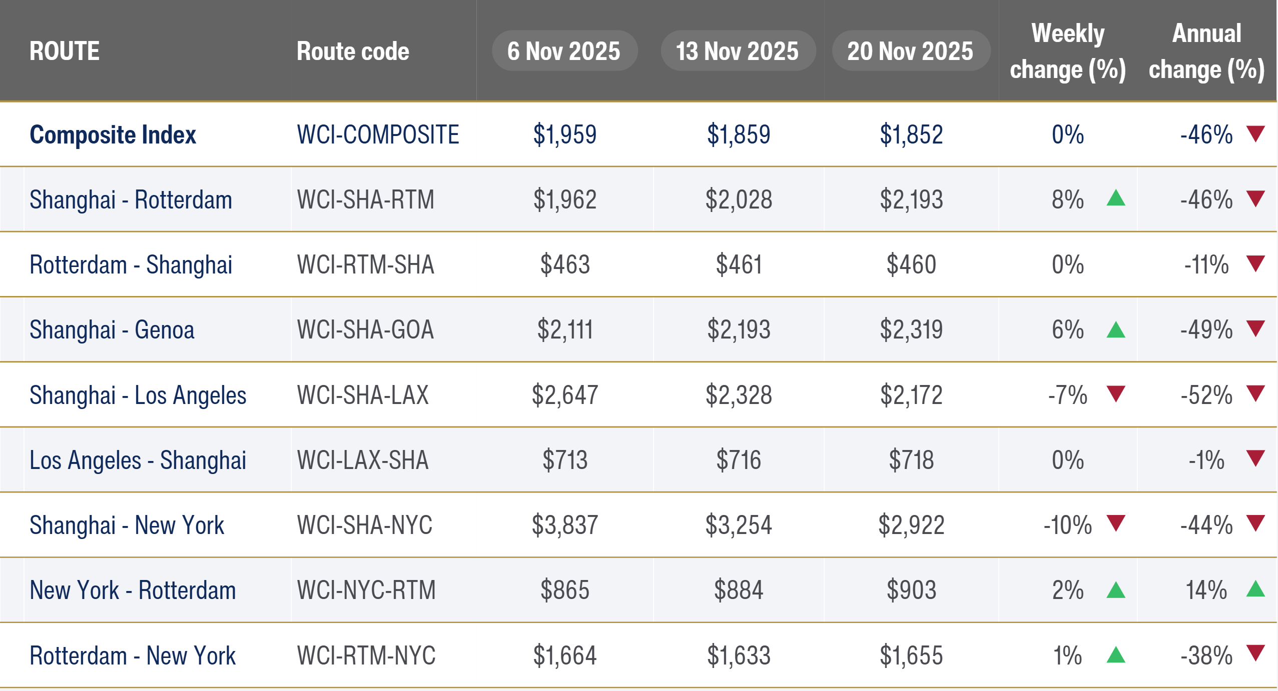 Shanghai–New York dropped -6% WoW to $2,735, marking a third straight weekly decline as Transpacific headhaul rates continued to weaken.