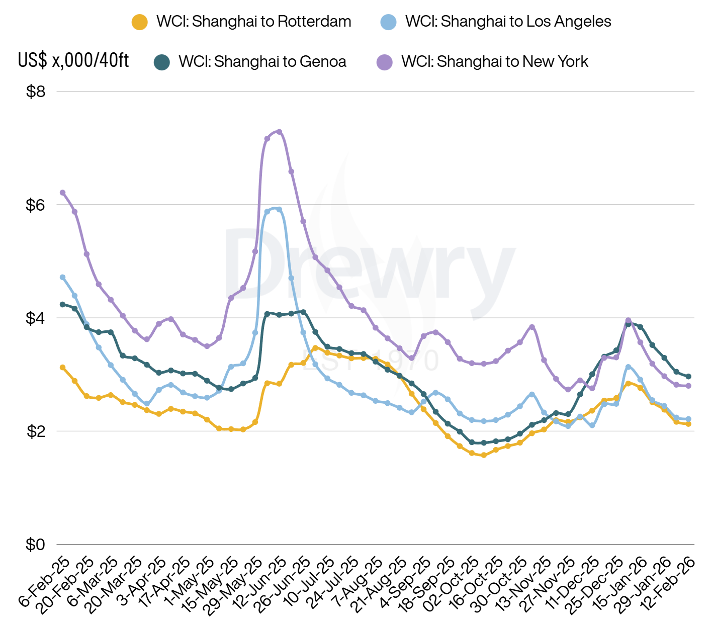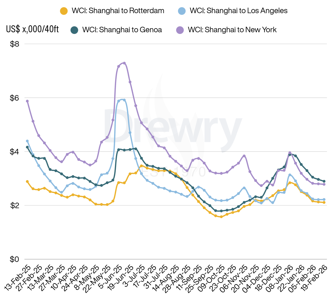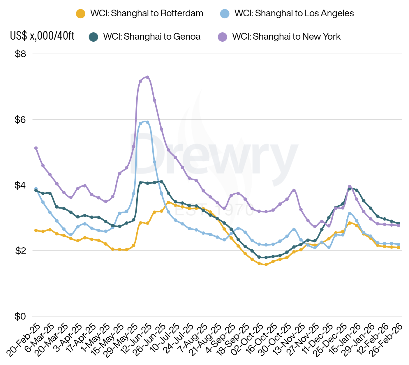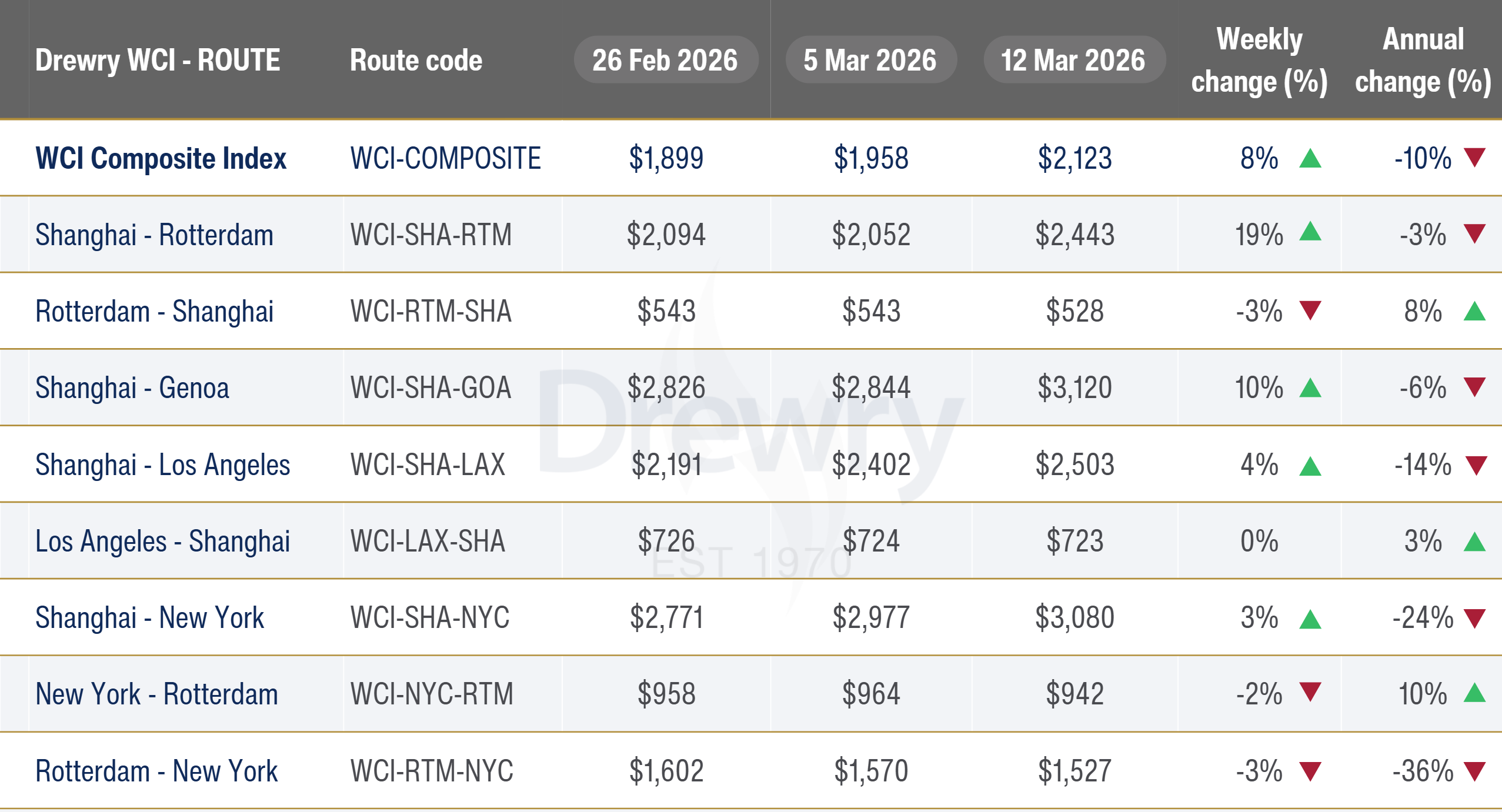 The Drewry World Container Index (WCI) increased 8% to $2,123 per 40ft container, mainly due to a sharp rise in rates on the Asia–Europe route, alongside gains on the Transpacific route. Notably, while double-digit growth was observed on the Transpacific route last week, the Asia–Europe route recorded a double-digit increase this week.