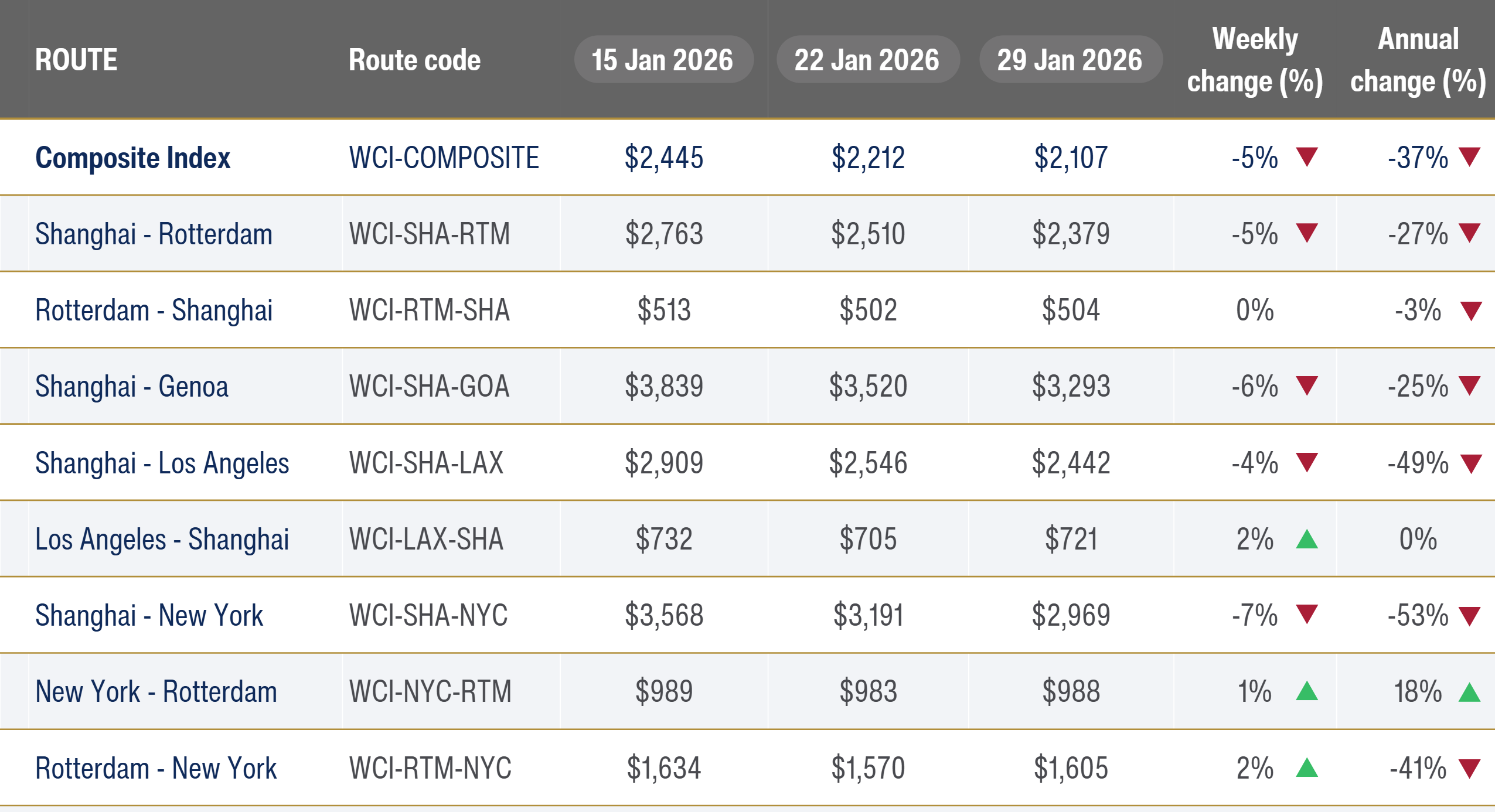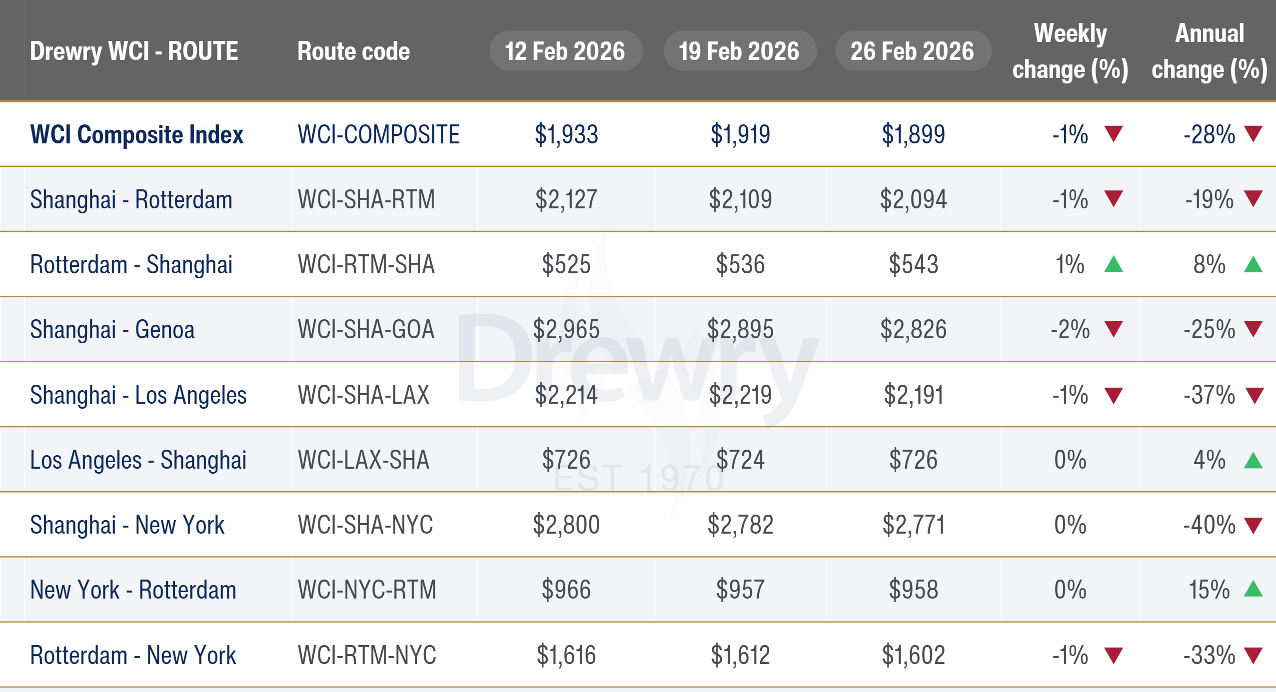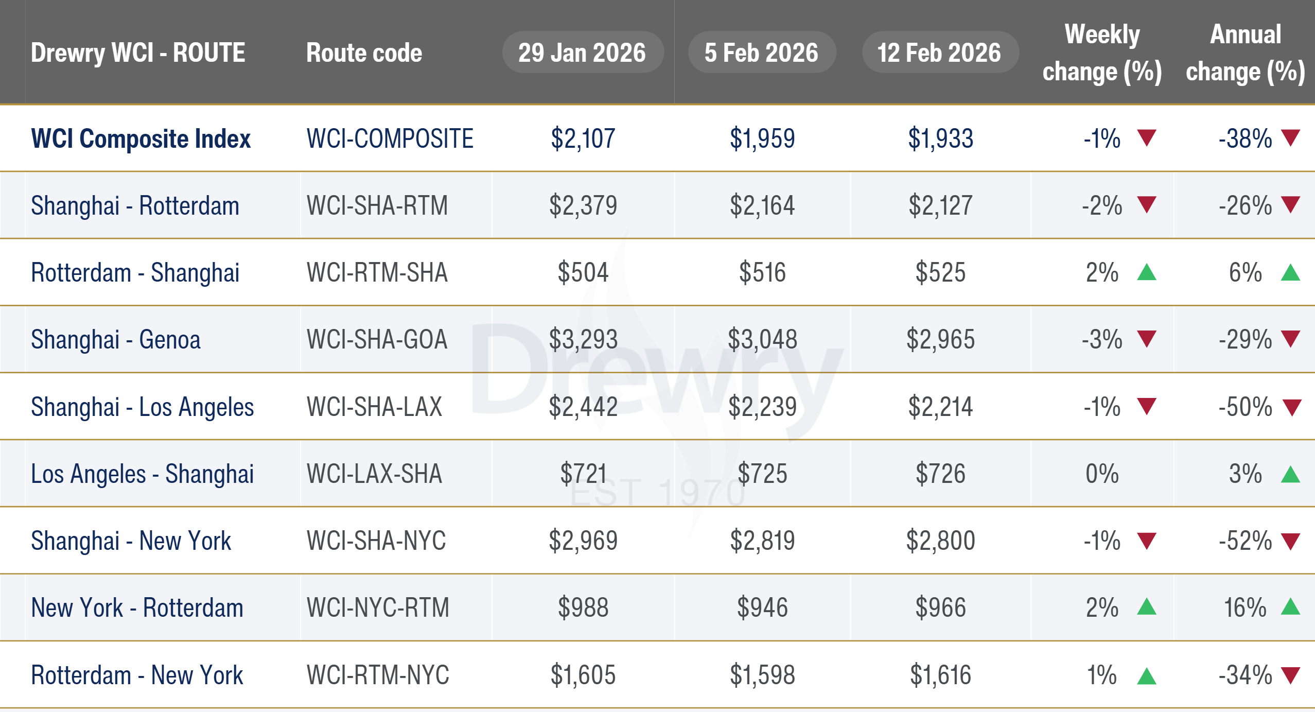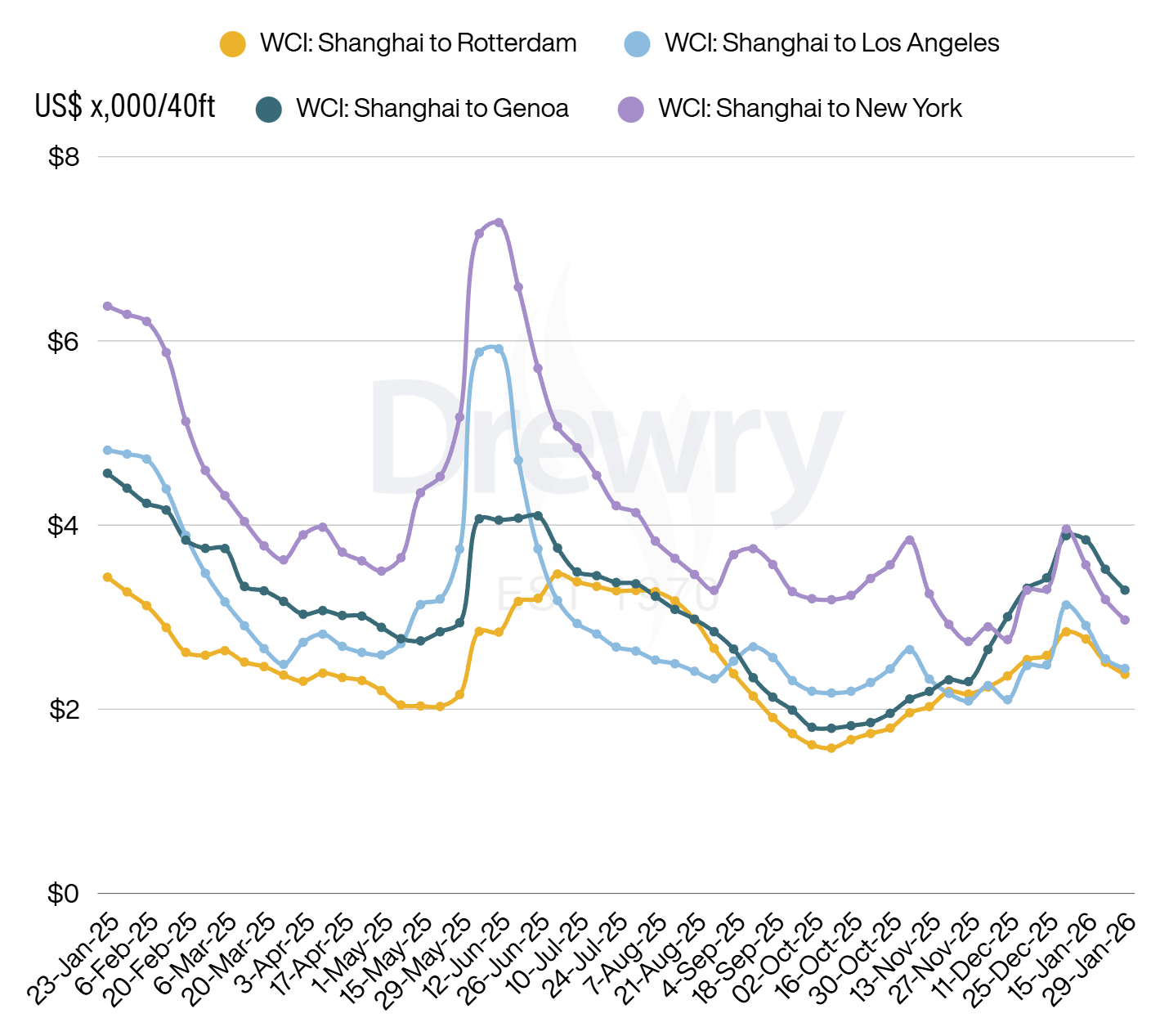 The Drewry World Container Index (WCI) increased 8% to $2,123 per 40ft container, mainly due to a sharp rise in rates on the Asia–Europe route, alongside gains on the Transpacific route. Notably, while double-digit growth was observed on the Transpacific route last week, the Asia–Europe route recorded a double-digit increase this week.