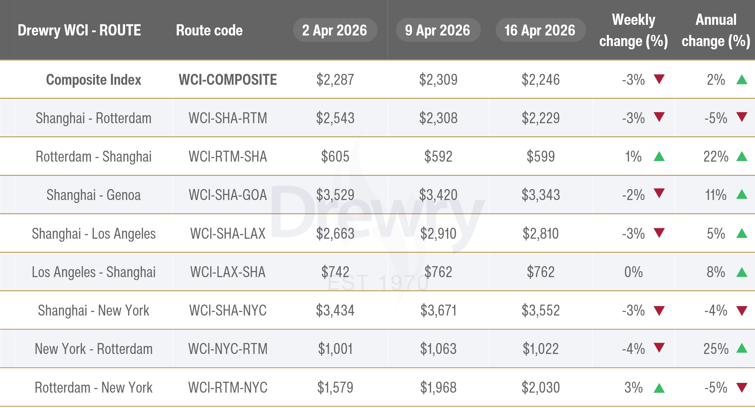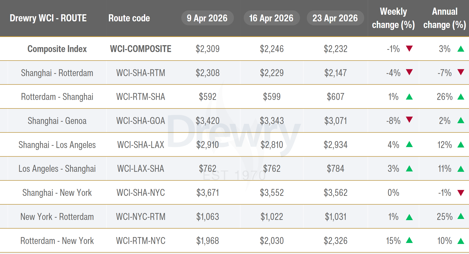 - Spot rates on the Transatlantic trade route increased in double digits this week. Although rates on this lane are typically stable, they have been rising since the end of March. Freight rates on the Transatlantic route increased 15% to $2,326 per 40ft container, driven by capacity reductions and the implementation of $1,100 per 40ft container PSS by carriers, effective 15 April.