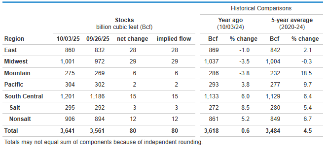 Natural gas storage levels increased 80 Bcf to 3,641 Bcf last week, above expectations of a 76 Bcf build. Inventory levels are up 0.6% YoY (vs 0.6% YoY last week) and are now up 4.5% compared to the 5-year average (vs 5.0% last week).