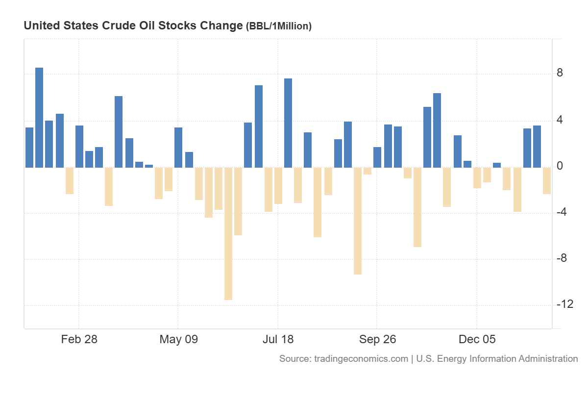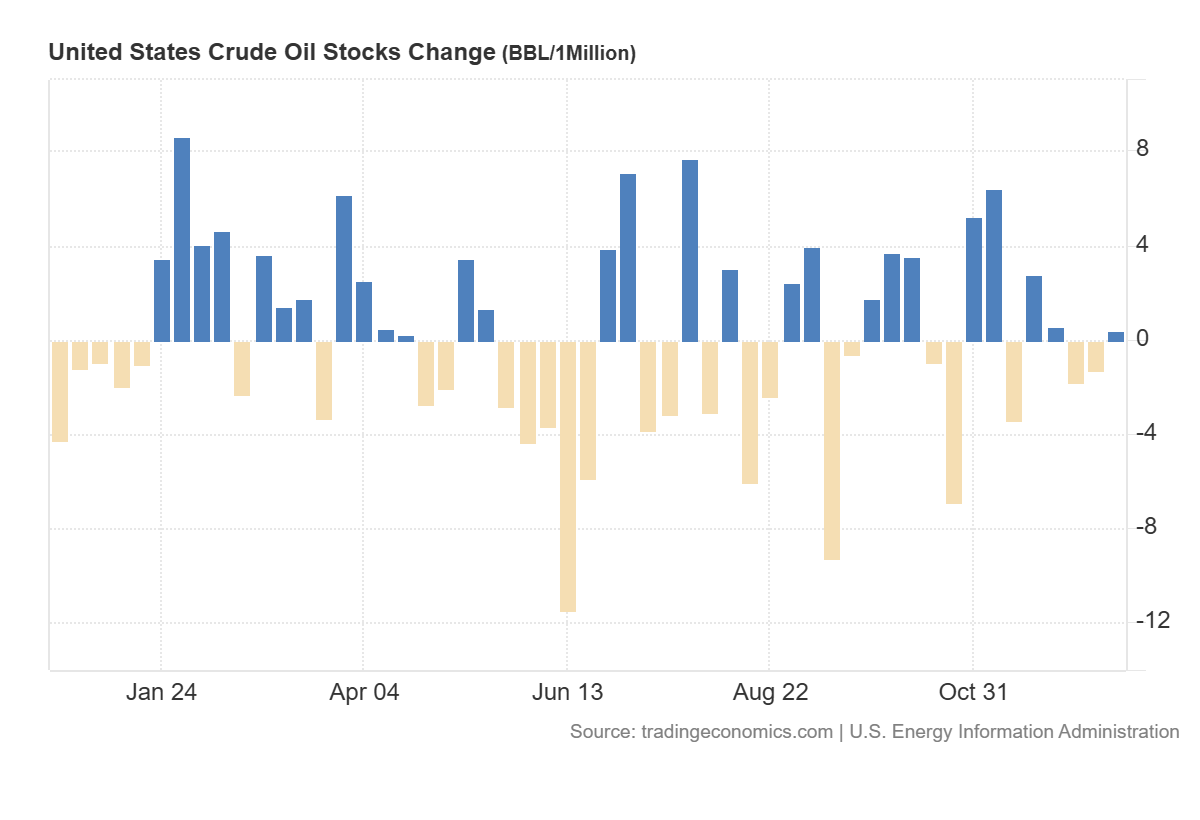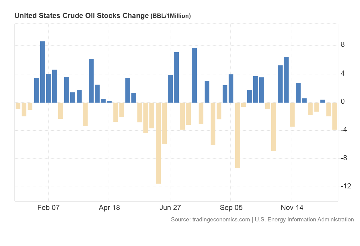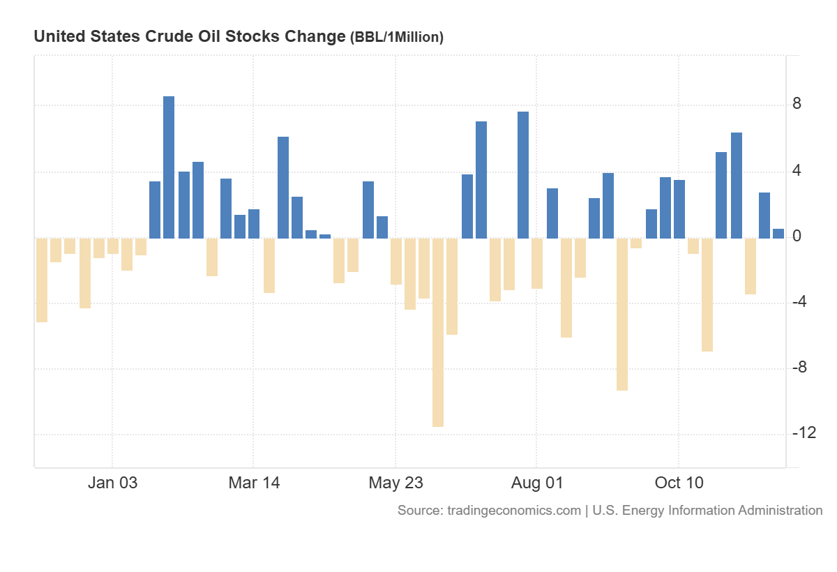 U.S. commercial crude oil inventories fell -2.3M bbl (vs +1.75M bbl expected) WoW to 423.8M bbl in the week ending Jan. 23, 2026, reflecting a modest draw alongside mixed refined product builds.